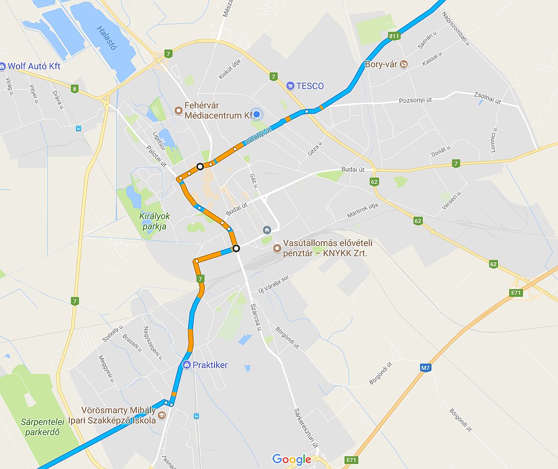 -Székesfehérvár: Béla út - Berényi út - Szekfű Gyula utca - Mátyás király körút - Schwäbisch-Gmünd utca - Palotai út - Vörösmarty tér - Széchenyi út - Horvát István út - Balatoni út - Úrhidai út