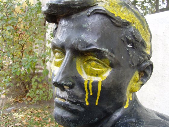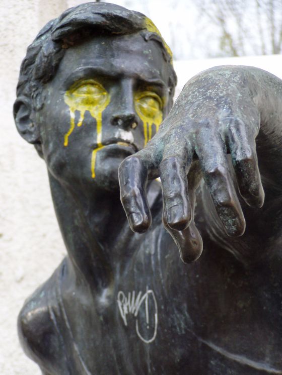 Turáni Kovács Imre diszkoszvető szobra is látott már szebb napokat a Jáky József Szakközépiskolában. Az intézményről nemrégiben eltűntette a nemkívánatos falfirkákat a Széphő, azonban az iskola Martinovics utca felöli oldalában vandál kezek összefirkálták és ahogyan a képen is látható citromsárga festékszóróval lefújták a sportember szemét.