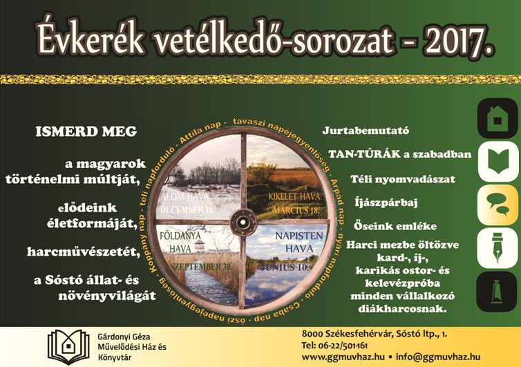 Tovább forog az évkerék március 18-án 9.30-tól a Zöld Tanyán, majd a Gárdonyi Géza Művelődési Házban. A vetélkedősorozat résztvevői megismerhetik a magyarok történelmi múltját, elődeink életformáját, harcművészetét, valamint a Sóstó állat és növényvilágát. A diákokat tan-túrák, íjászpárbajok és harci mezbe öltözött kard, íj- és kelevézpróba is várja.