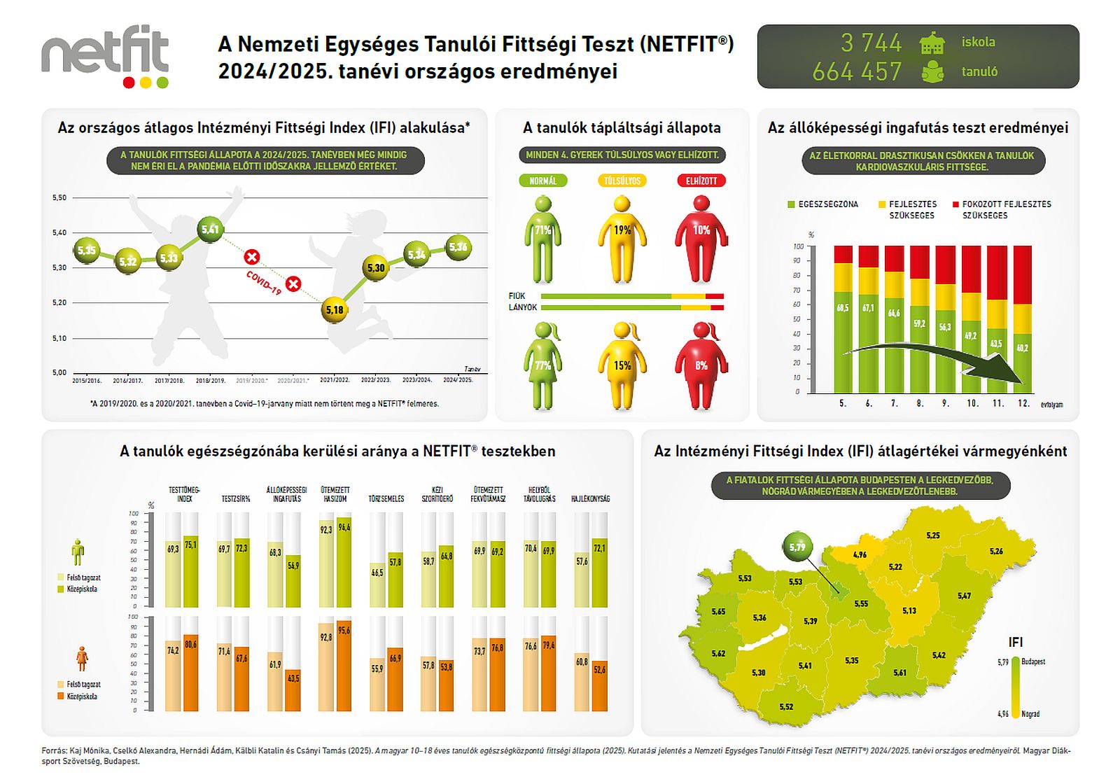 2026. január 12-én elindult az aktuális tanévi NETFIT® (Nemzeti Egységes Tanulói Fittségi Teszt) felmérése a hazai általános és középiskolákban. Ennek kapcsán a felmérést koordináló Magyar Diáksport Szövetség közzétette a 2024/2025. tanévi felmérés eredményeit. A tavaly tizenegyedik alkalommal elvégzett NETFIT® mérések összesen 3744 iskolában 664 457 tanuló fittségi adatait rögzítették.