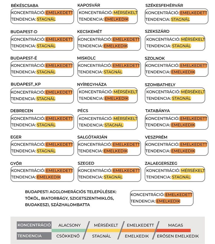 A 44. héten tovább nőtt a SARS-CoV-2 örökítőanyag átlagkoncentrációja a szennyvízben, ez a tendencia várhatóan tovább folytatódik. A vizsgált településeken emelkedő tendencia látható a Budapest környéki agglomeráció közös mintájában, valamint Győrben, Kaposváron, Kecskeméten, Nyíregyházán, Salgótarjánban, Szolnokon, Tatabányán és Veszprémben.
