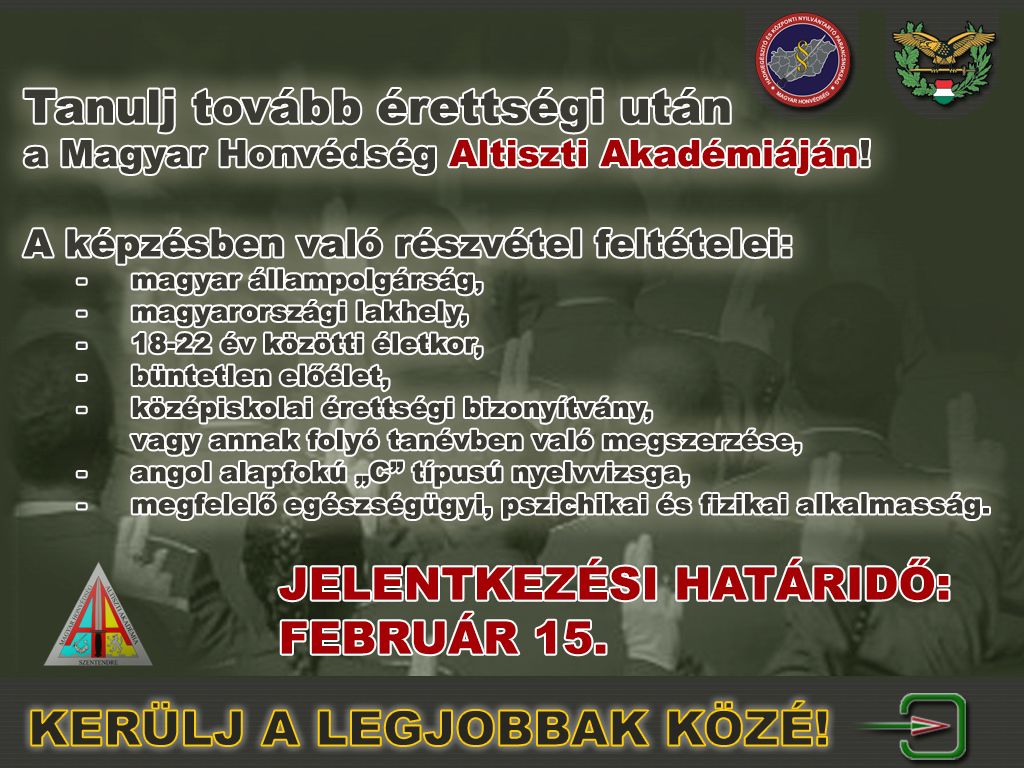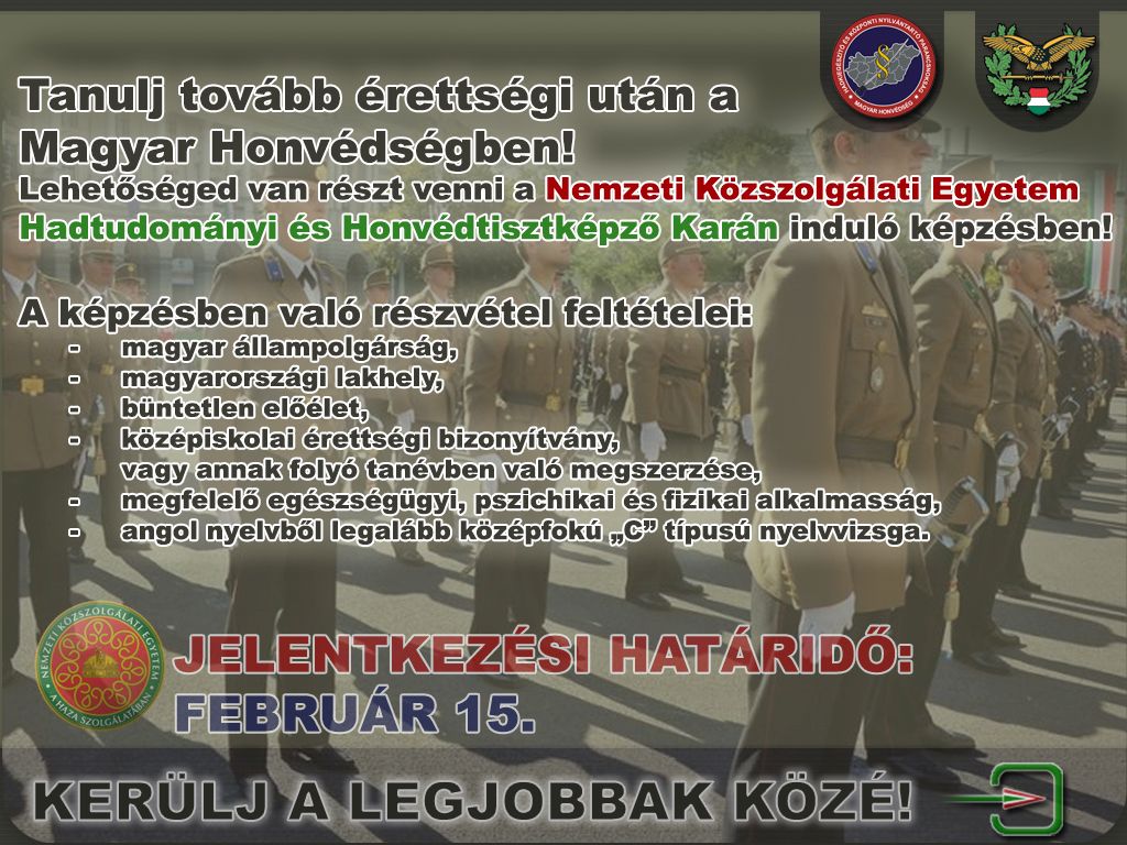 A Magyar Honvédség keretén belül is lehetőség van érettségi után továbbtanulni. A jelentkezőknek a Namzeti Közszolgálati Egyetem Hadtudományi és Honvédtisztképző Karának képzése nyújt továbbtanulási lehetőséget és a Magyar Honvédség Altiszti Akadémiája is várja a fiatalokat. A jelentkezéshez magyar állampolgárság, érettségi, középfokú nyelvvizsga és bűntetlen előélet szükséges.