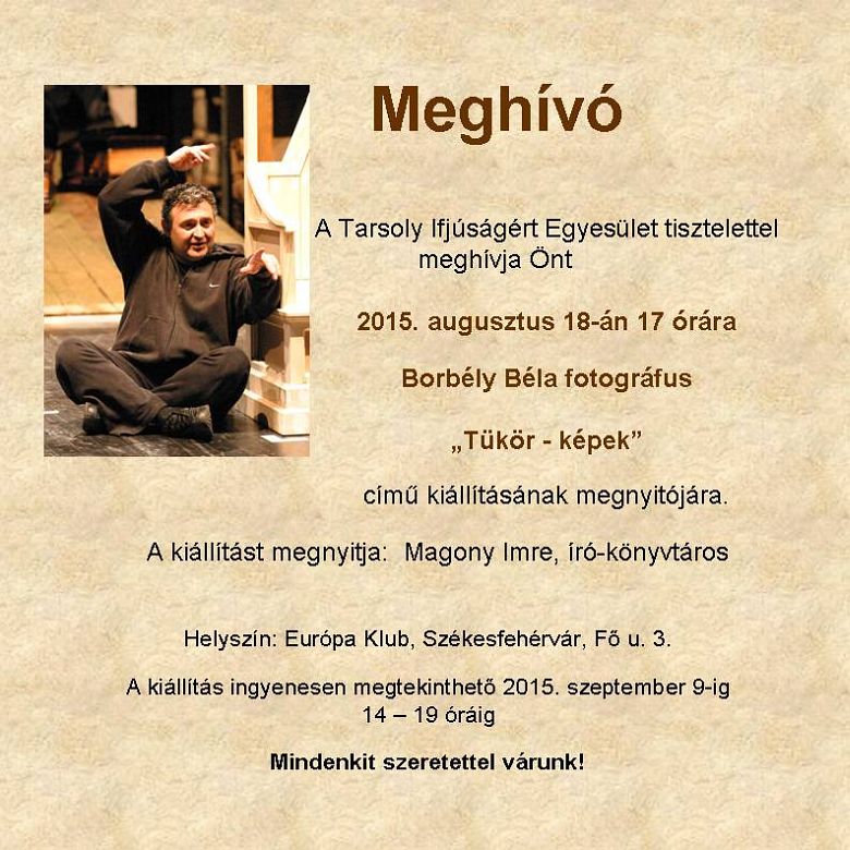 Augusztus 18-án 17 órakor az Európa Klubban nyílik meg Borbély Béla fotográfus kiállítása. A tárlatot a Tarsoly Ifjúsági Egyesület szervezi és szeptember 9-ig látható a Fő utca 3. szám alatt. A Tükör - képek című kiállítást Magony Imre író-könyvtáros nyitja meg.