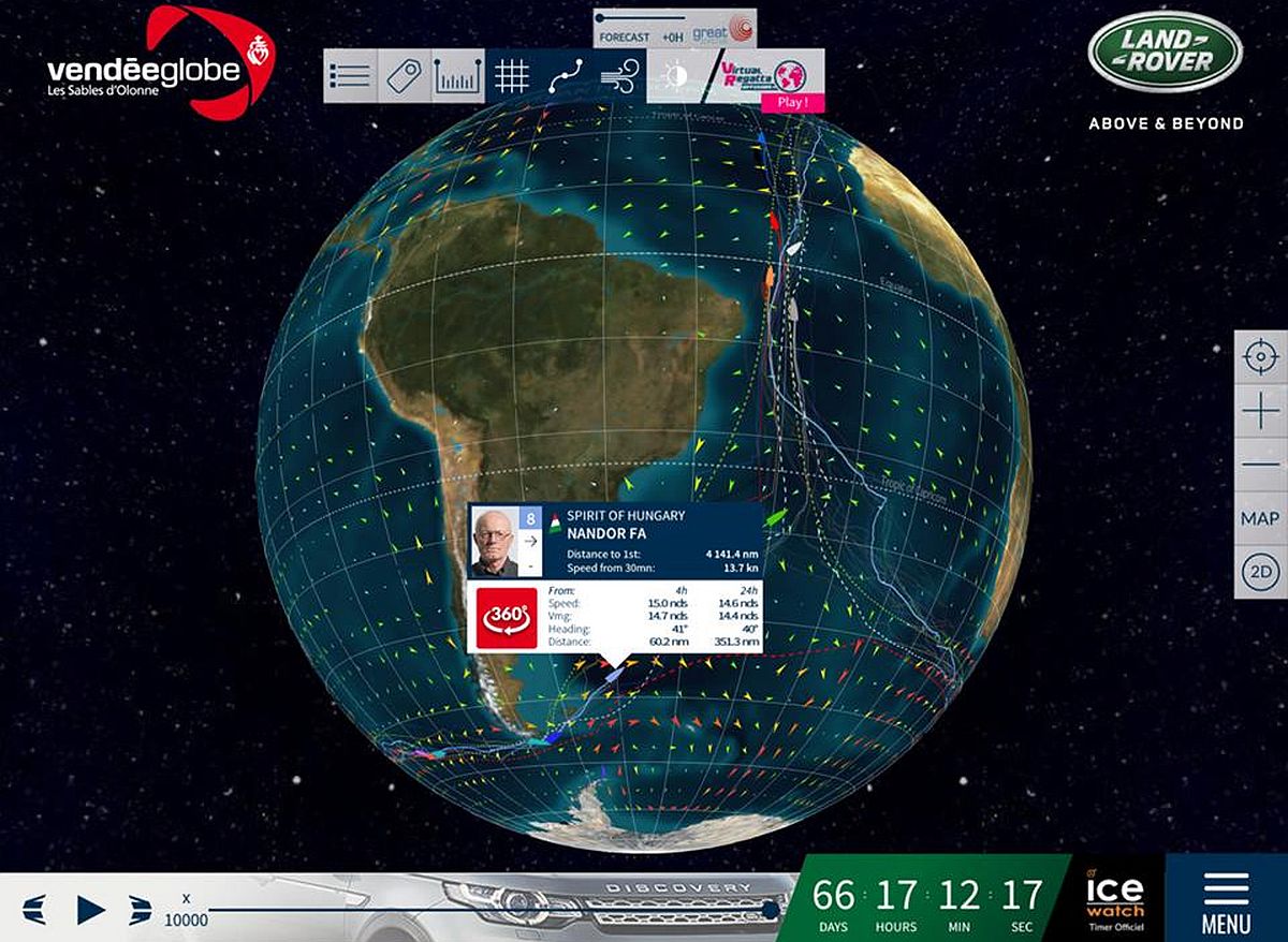 Immáron 66 napja van versenyben Fa Nándor a Vendée Globe mezőnyében a Föld körül. A 2016. november 6-án 29 indult IMOCA OCEAN MASTERS mezőnyből súlyos hajósérülések miatt 18-an maradtak versenyben. Három nappal a legendás Horn-fok kerülése után, búcsút intve a Déli óceánoknak, a Dél-Atlanti-óceánon, az Üvöltő Negyvenesek birodalmában a Spirit of Hungary “hazafelé” tart. A magyar versenyző, vitorlázó karrierje során ötödször kerülte meg a hajóslegenda szerint “rettegett Horn-fokot”. A napokban a mezőny három leggyorsabb hajói közt regisztrálták az SOH adatait.