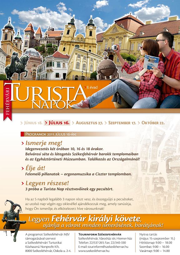A Ciszter templomban orgonamuzsika várja a látogatókat, ahol a nagy melegben jól fog esni egy kis hűsítő pihenés. A felemelő program végén ismét néhány feladat megoldására bíztatjuk a Turista Nap résztvevőit, akik a helyes megoldásért kapott pecséteket a kiosztott kis füzetben gyűjthetik. A rendezvénysorozat végén az októberi Turista napon a visszahozott pecsétekért a Tourinform irodában a résztvevők ajándékban részesülnek.