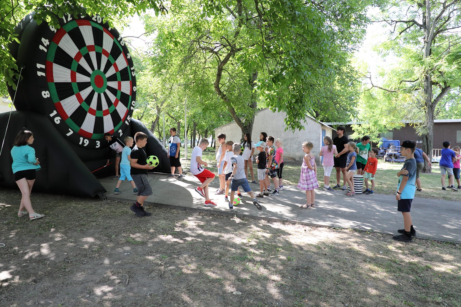 Az Értékmentők by iGenerációért Egyesület elnöke, Pletser Ádám elmondta, hogy mindig igyekeznek segíteni olyan programokat és kezdeményezéseket, ahol fiatalok vannak: "Most arra nyújtunk lehetőséget a Napraforgó tábor résztvevőinek, hogy kipróbálhassák az óriás dartsfocit. Egy 4,5 méter magas táblát hoztunk, az ezen lévő köröket kell eltalálni tépőzáras labdával" - mondta el Pletser Ádám, hozzátéve, hogy a program visszatérő eleme lesz a tábornak, heti egy alkalommal.