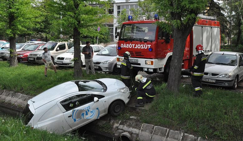 Vízbe csúszott autóhoz kérték a katasztrófavédelem segítségét május 7-én, kedden délelőtt. Székesfehérváron, a Szabadságharcos úti parkolóban álló autó – amelyben senki sem ült - a mögötte húzódó, körülbelül két méter mély vízelvezető csatornába gurult.