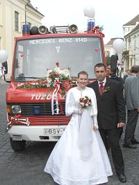 Az ifjú pár egy feldíszített gépjárműfecskendőn gördült be a Városház térre. A ceremóniát követően a székesfehérvári tűzoltóság szolgálatban lévő tagjai díszsorfallal és szirénaszóval köszöntötték az ifjú párt.