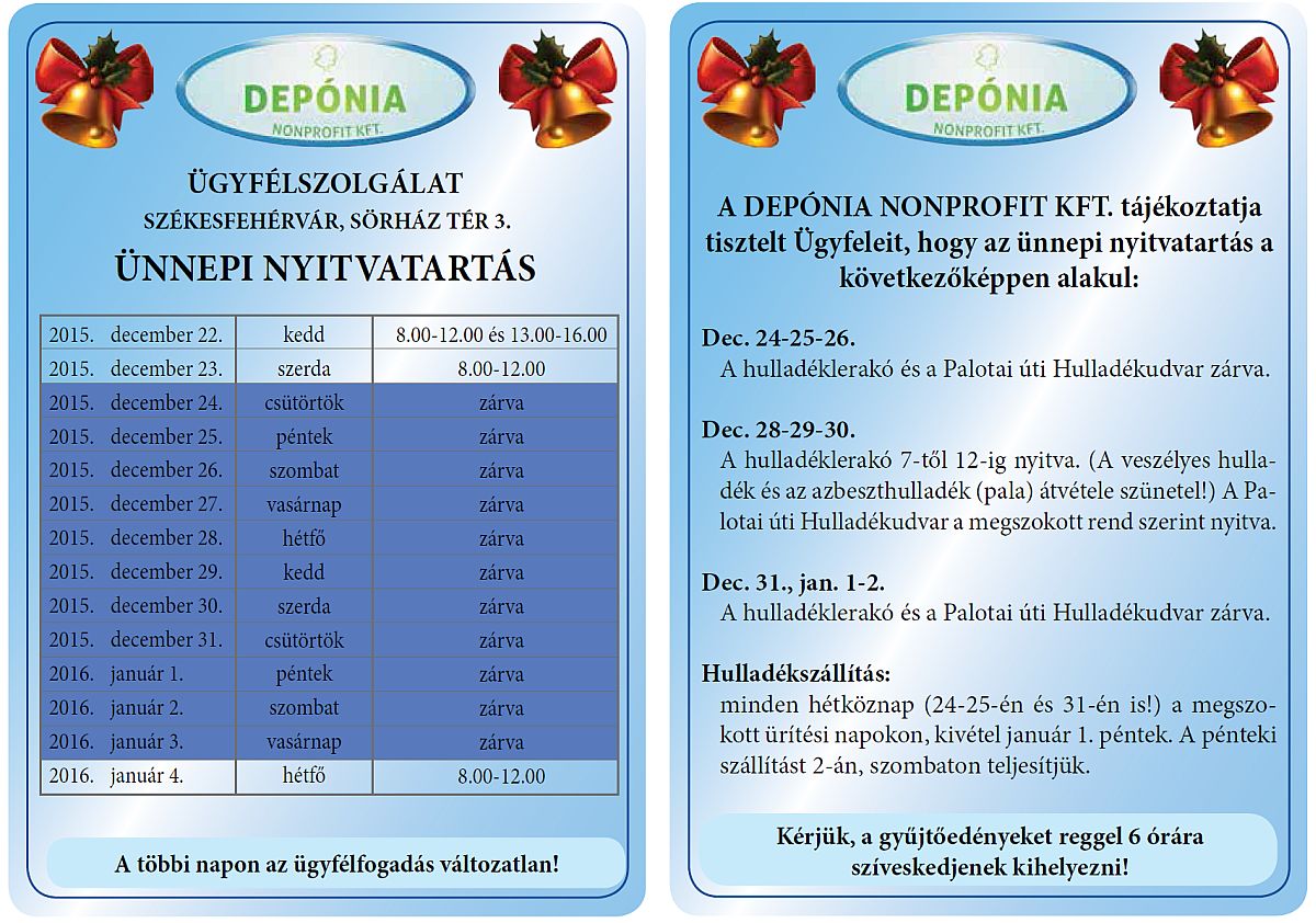 Ügyelet, ügyfélszolgálat, közlekedés, szemétszállítás és nyitva tartás az ünnepek alatt