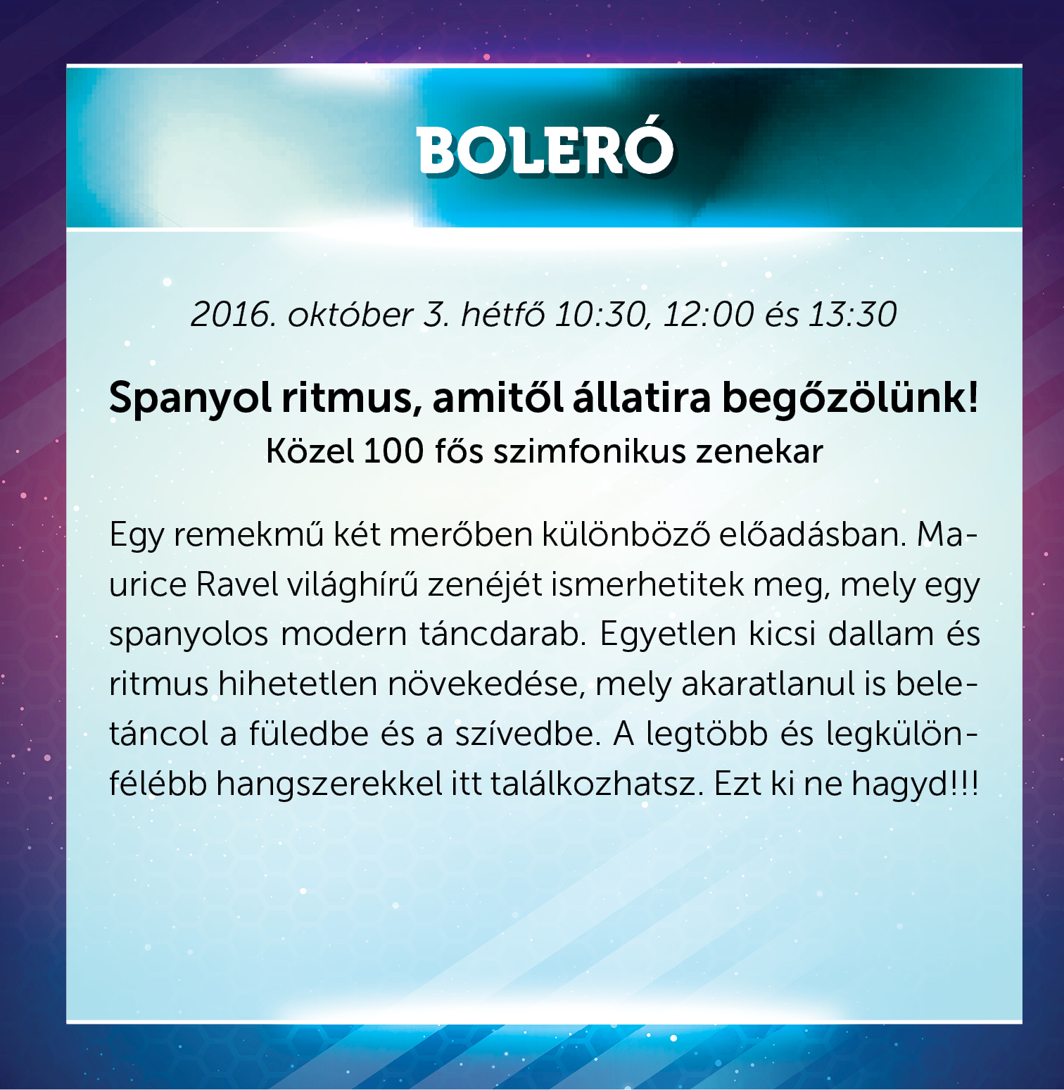 Az első koncertre október 3-án kerül sor: a Boleró a közel száz fős szimfonikus zenekarral igazi, vérbő spanyol hangulatot, ritmust közvetít, miközben igazi hangszerparádét láthatnak a gyerekek. Ravel világhírű, fülbemászó zenéjét két különböző előadásban mutatják be a közönségnek, a hagyományos mellett egy humoros feldolgozást ígérnek. Az előadások időpontjai: 10.30, 12 és 13.30 óra.