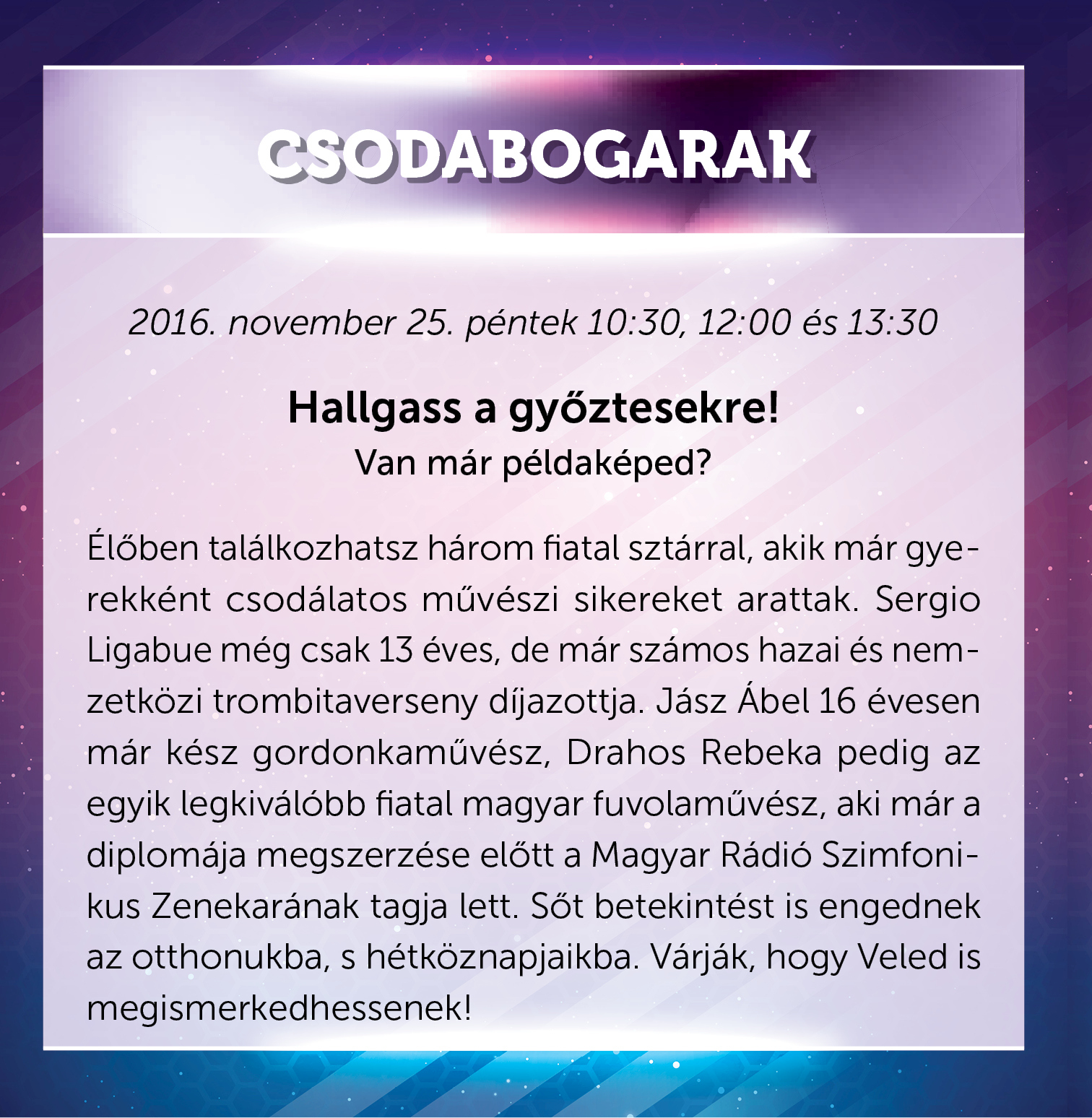 November végén jönnek a Csodabogarak, és kiderül, milyen életet élnek a sikeres emberek! A közönség három fiatal sztárral, rendkívüli tehetséggel találkozhat élőben, akik az otthonukba és a hétköznapjaikba is betekintést engednek. A három generációból Sergio Ligabue 13 éves diákot számos hazai és nemzetközi trombitaversenyen díjazták, a 16 éves Jász Ábel már kész gordonkaművész, Drahos Rebeka pedig már a Magyar Rádió Szimfonikus Zenekarának a tagja.