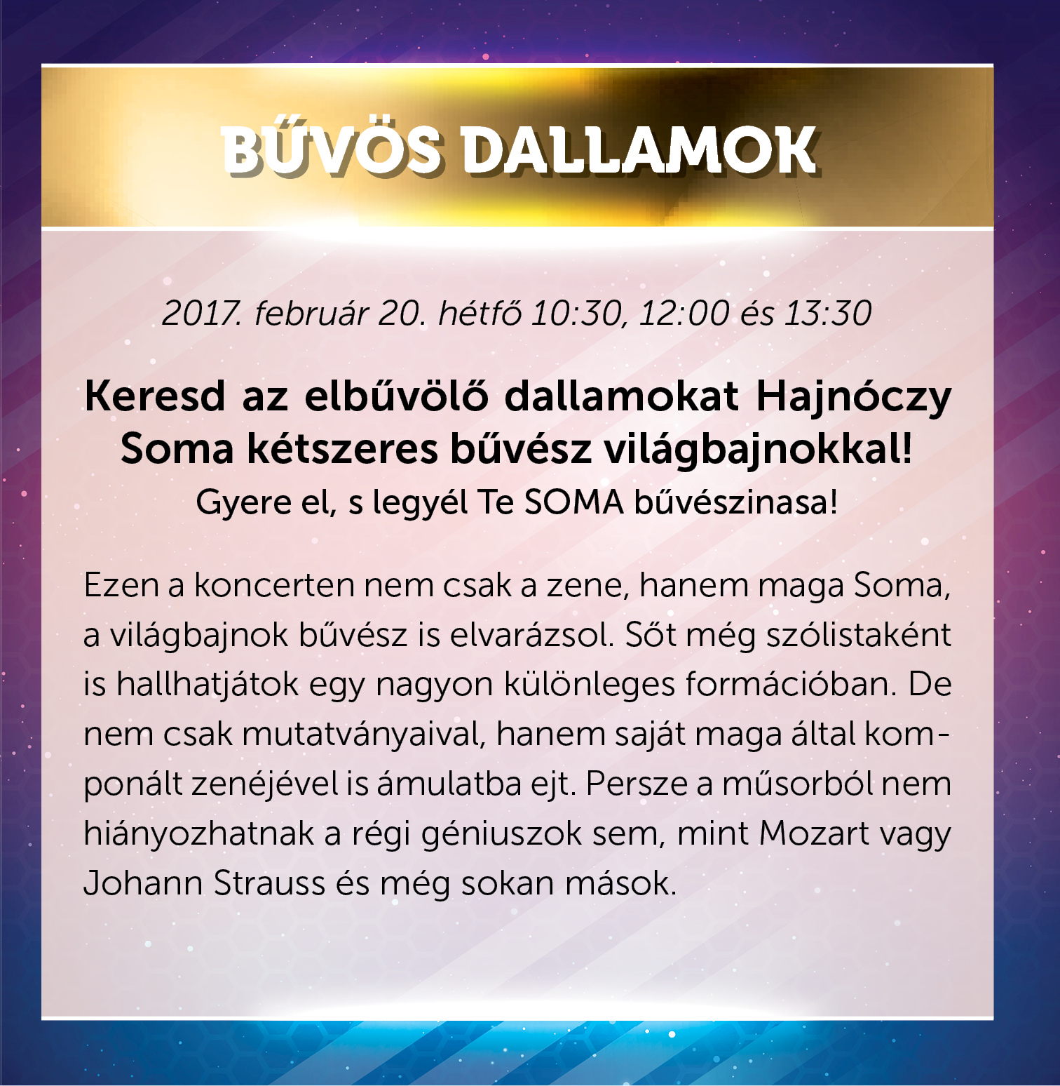 Bűvös dallamokat ígér a februári program, amit a környező településeken is szeretnének bemutatni. Hajnóczy Soma kétszeres bűvész világbajnok is közreműködik az előadásban – így a varázslat is kétszeres lesz: a zene mellett fantasztikus mutatványok és egy különleges formáció várja a közönséget. Mozart és Strauss dallamai is felcsendülnek a hangversenyen.