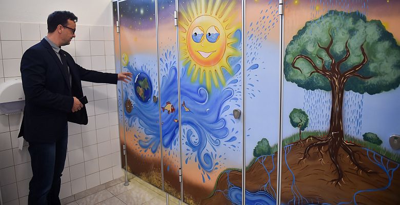 A Munkácsy Mihály Általános Iskolában látványos, színes tematikus ábrákkal dekorálták a mosdók ajtaját, illetve a mosdókat elválasztó fülkéket; a képek a víz körforgását ábrázolják szimbolikusan, gyereknyelven. A pályázat kapcsán elkészített molinók ábrái a szürkevíz felhasználását mutatják be egy ötletgazdag, gyerekek számára is érthető grafikus megoldással – mindez azzal a céllal, hogy kreatív módon tanítsák a gyerekeket akár a kézmosás fontosságára, a víz értékének megóvására, a takarékosságra. „Egyszerre infrastrukturális és pedagógiai-módszertani eszközfejlesztés is történt.” – jellemezte a beruházás fontosságát Tóth Péter igazgató. „A nyolc elemből álló vizes tanösvényünk saját innováció: a roll-up felületek képei a földi élet kialakulásától egészen a víz pusztító erején keresztül az emberi testben betöltött szerepéig feldolgozzák a víz témakörét. Ebből az egyik elem egy olyan interaktív társasjáték, ami minden korosztályt érint – ezt mostantól minden évben használhatjuk a víz világnapján vagy egyéb öko-programjainkon.” A gyerekek ivóvízfogyasztását tekintve az igazgató elmondta, hogy intézményük egyértelműen a jó minőségű, fehérvári csapvíz pártján áll, és sok éve képviseli a cukrozott italok mellőzését az iskolában – ami nem mindig konfliktusmentes, de az egészséges életmód elveiből nem engednek, és következetesen képviselik álláspontjukat.