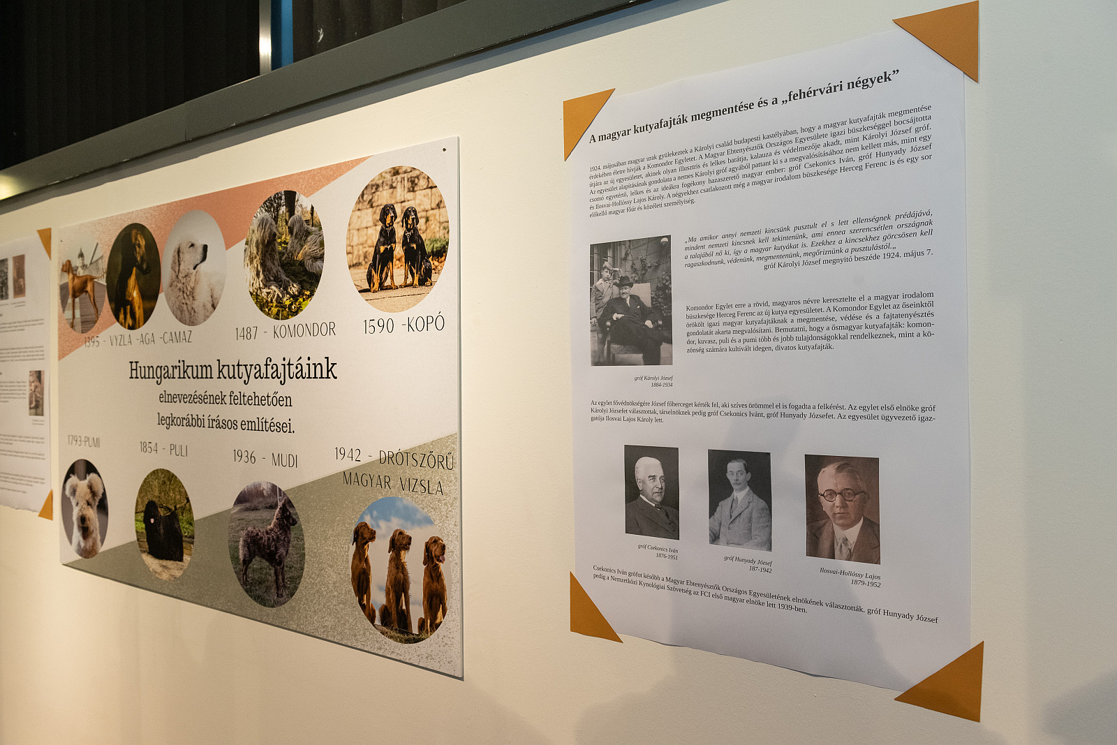 A megjelenteket Makó János kutyatörténeti kutató és Fekete Fruzsina régész kalauzolta a közös térben látható kiállításon. Az „Ősi nyomokon – Róma árnyékában, magyar földön” című kiállításon az érdeklődő láthat például olyan gorsiumi téglákat, amelyekre – még száradásuk közben – ráléptek a többezer éve élt ebek, így lábnyomukat megőrizték az örökkévalónak. Itt debütál az az 1936-ban előkerült, II. századi kutyaszobor is, amelyet sokáig nagymacskaként azonosítottak, ám amit Fekete Fruzsina és Makó János az állat jegyei és a megkurtított farok alapján „canis pugnax”-ként, azaz római harci kutyaként definiált. Mint megtudhattuk, a Nemzetközi Pumi Egyesület gondozásában lévő kutyatörténeti gyűjtemény számos különlegességgel büszkélkedhet, s egykoron a világ legnagyobbjának számított a maga mintegy 15 ezer tételével.