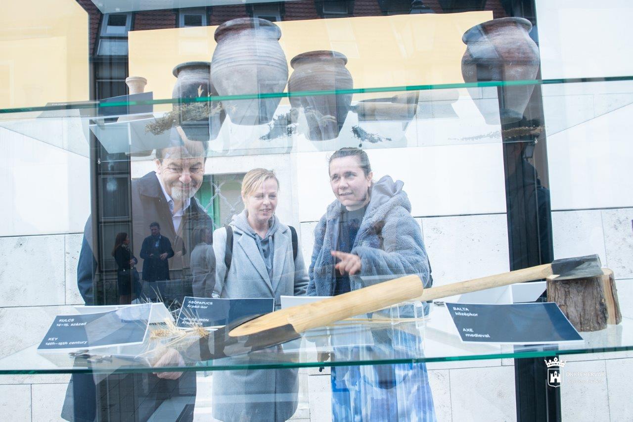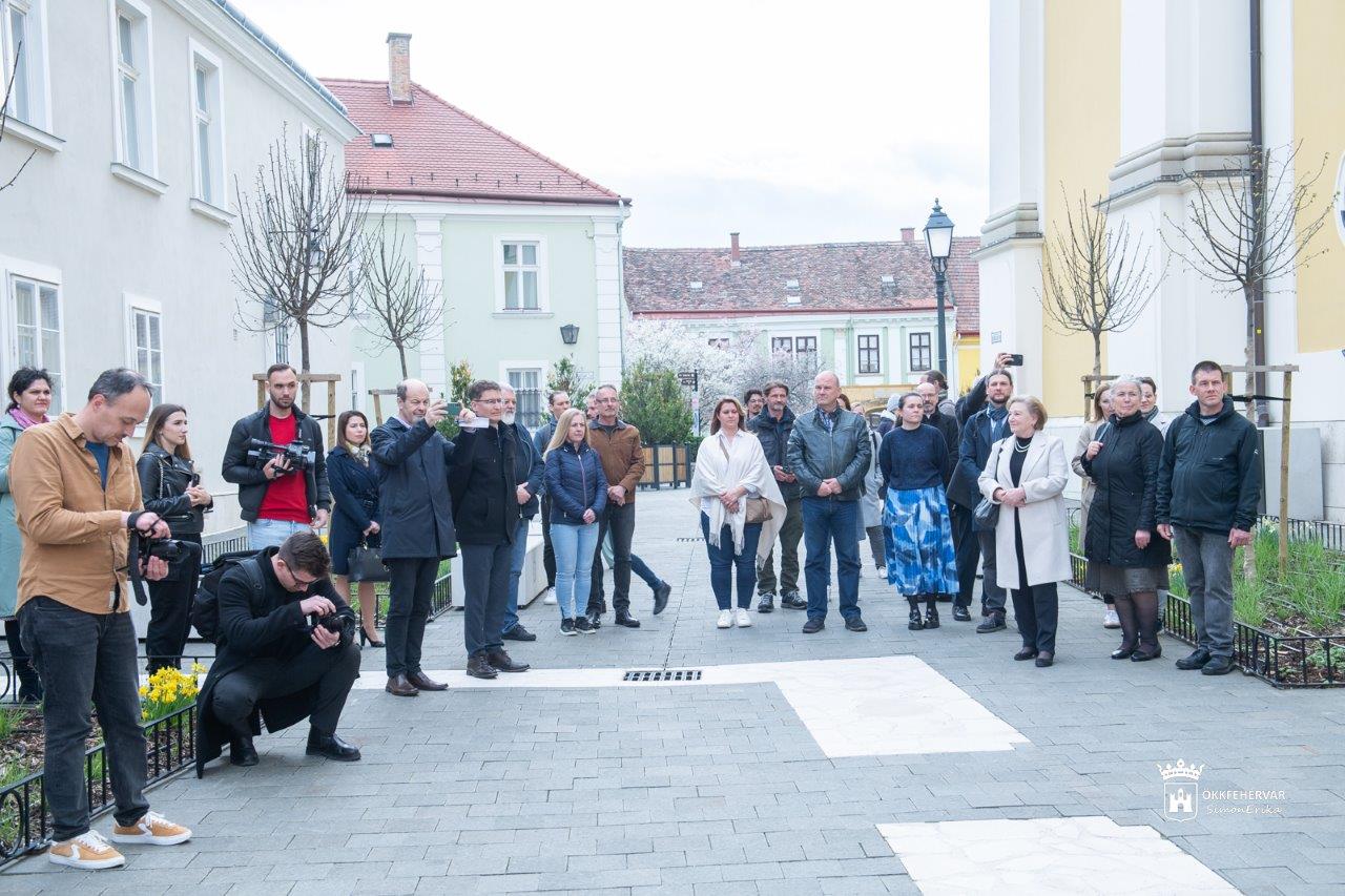Berek Veronika a Szent István Király Múzeum régésze a tér átadásán elmondta, hogy az ásatást dr. Reich Szabina régész vezetésével végezték a szakemberek 2022-ben és 2023-ban. Előkerült egy erődítmény alapozása valamint egy pillérsorokkal ellátott, csarnokszerű épület maradványa, továbbá egy 13. századi toronyépület és egy 14. században épült leégett gerendaház maradványa. "Itt került elő az egyik legérdekesebb lelet, egy Limoges-i zománcos korong, ami megtekinthető a Szent István Király Múzeum 150 éves évfordulójára rendezett kiállításon. Kések, szegek, kulcsok, tárolóedények kerültek még elő, amik másolatait kiállítottuk egy szabadtéri vitrinben. A tér nyugati oldalán pedig az egykori Szent Péter plébániatemplomhoz tartozó több mint négyszáz sír került feltárásra."