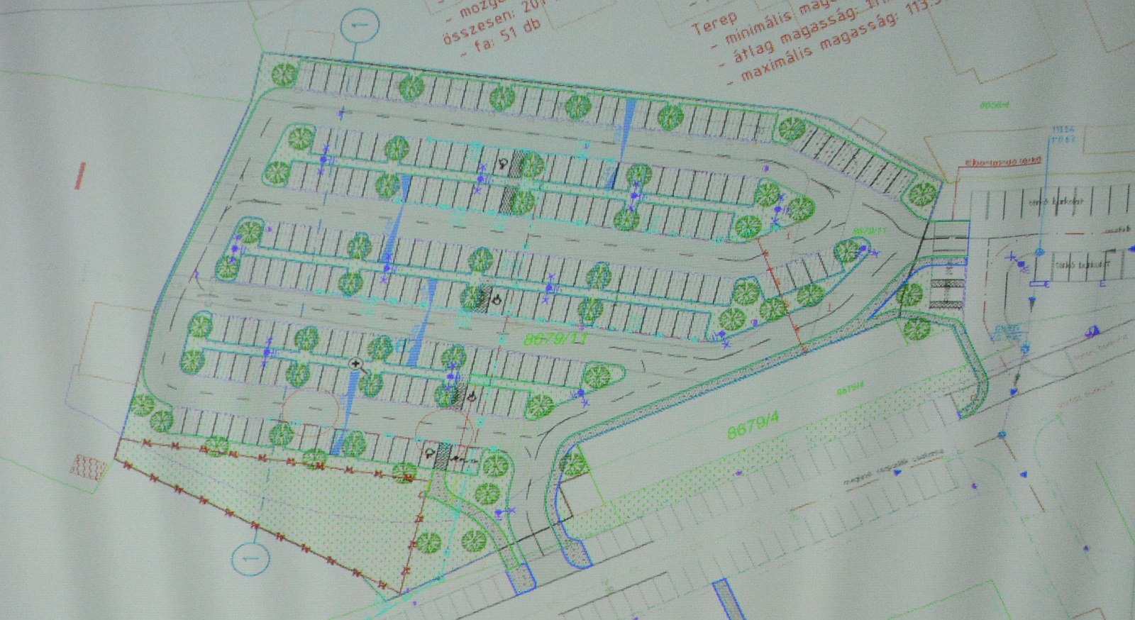 A lakossági fórumon az új, zöld szigetekkel ellátott parkolók terveit is bemutatták, ami a Fűtőerőmű területén épül a Sarló utcai épületek mögött.