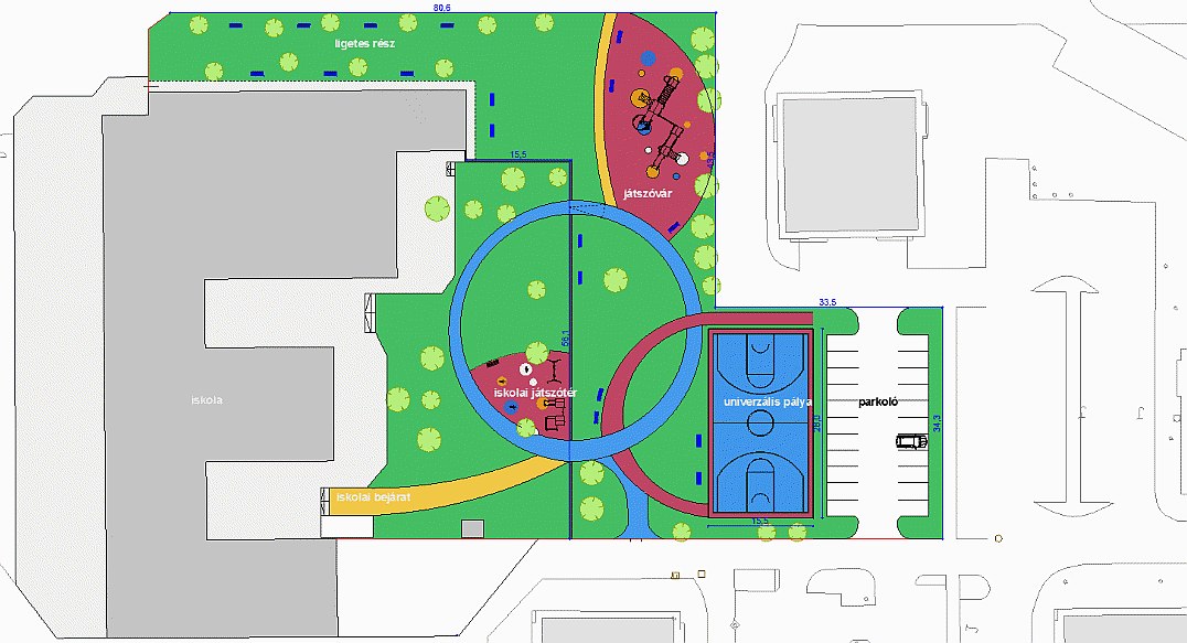 lesz egy játszótér hatalmas játszóvárral és több lesz a zöldterület is a jelenlegi murvás és aszfaltos burkolat helyett.
