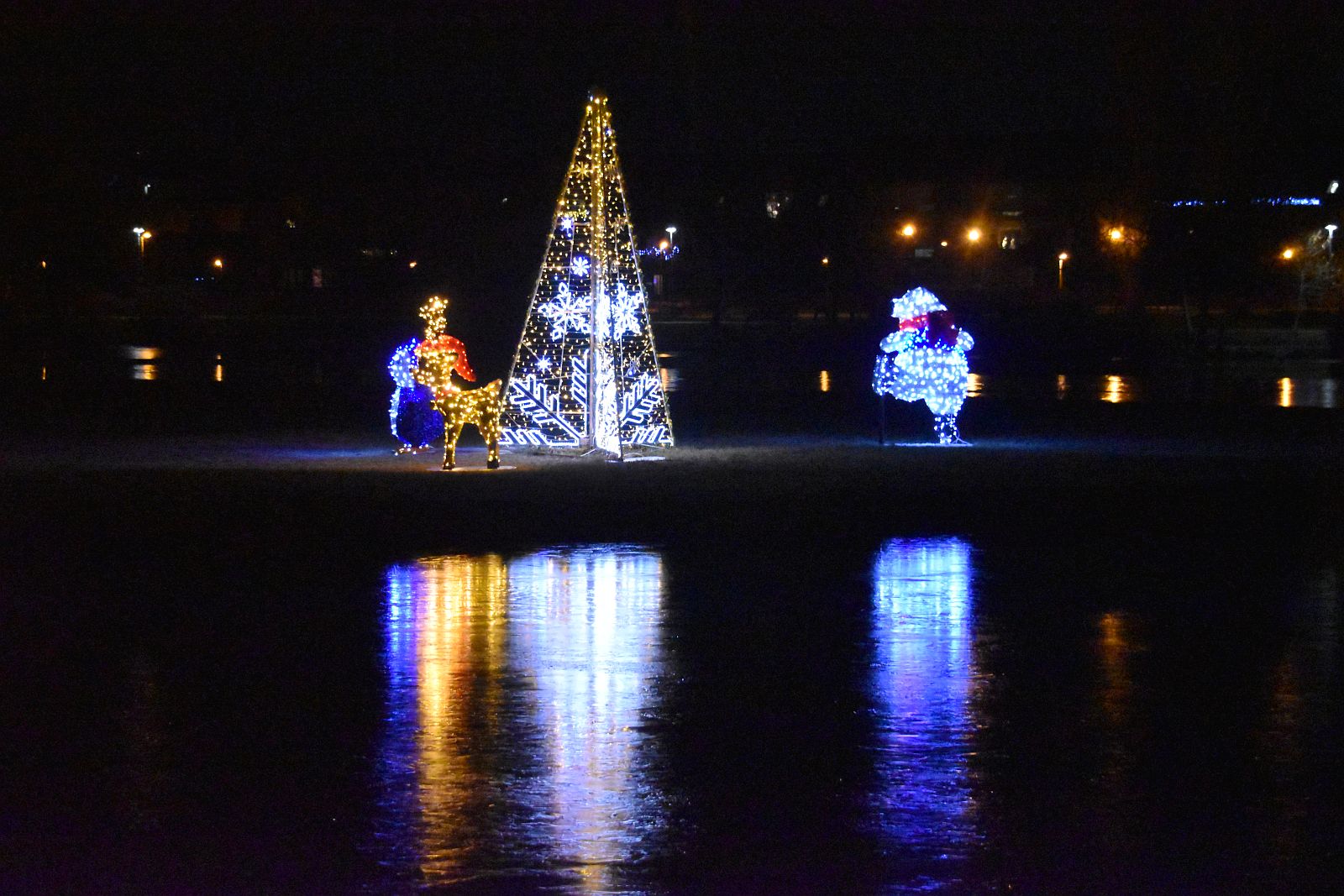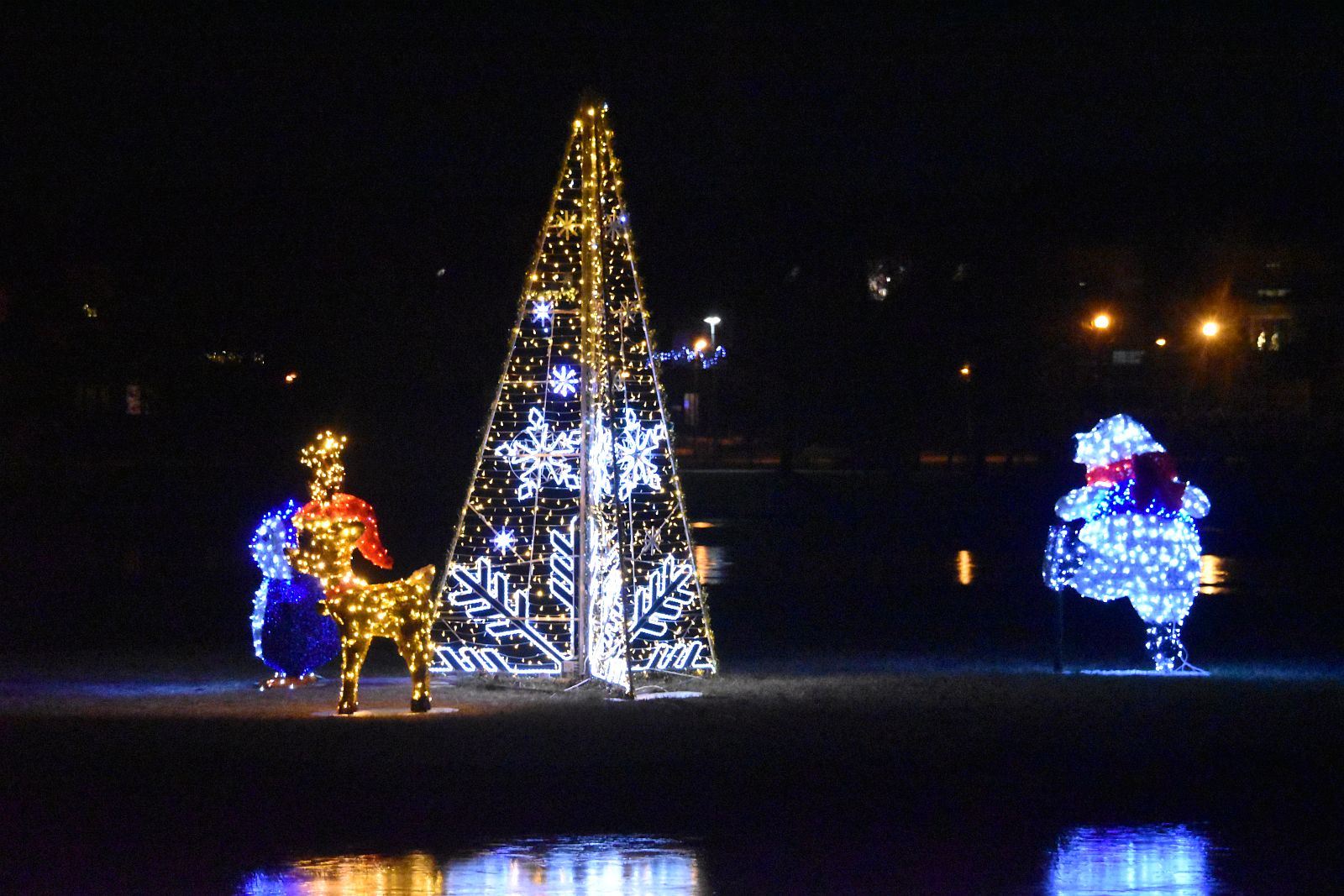 A fenyő alakú fénydísz idén is látható, de a sziget további installációkkal bővült a képviselő ígéretének megfelelően. Az idén három világító mesefigura - egy pingvin, egy rénszarvas és egy maci - fénye is tükröződik a tavon.