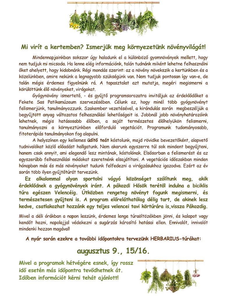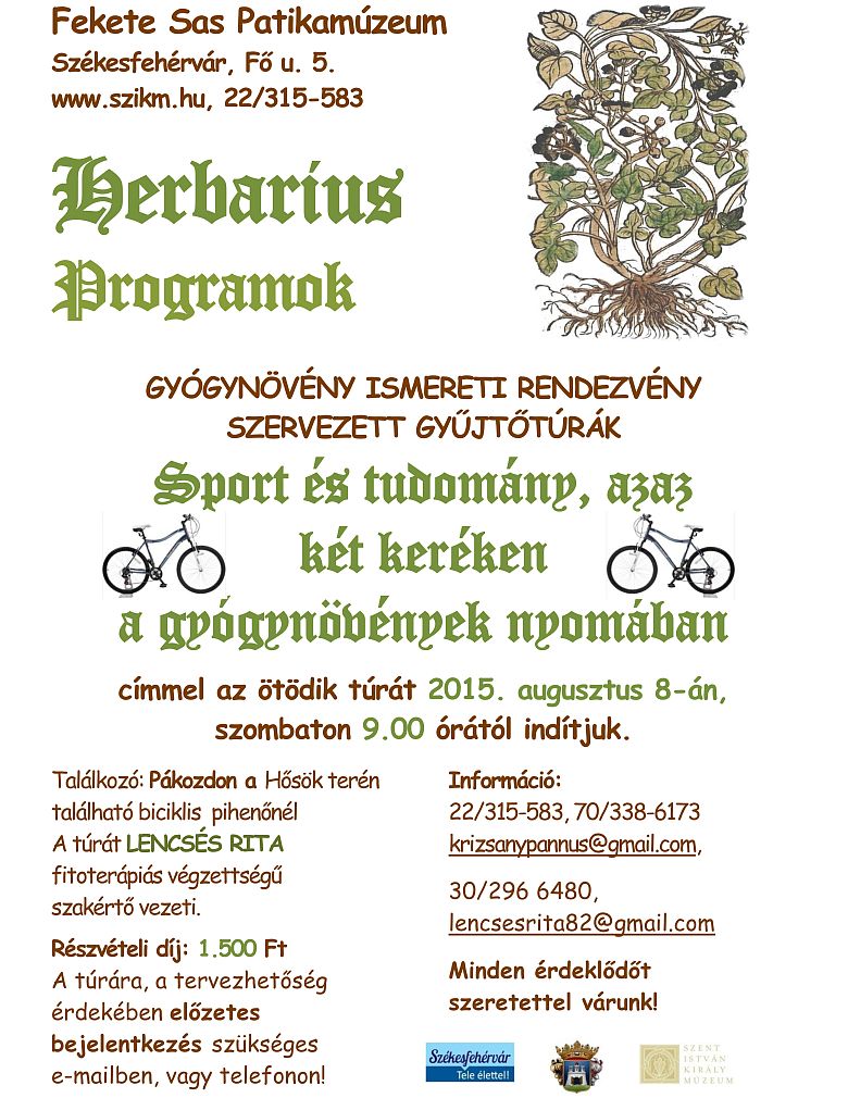 A Herbarius programok keretében új sorozat indult, amelynek során gyógy- növényekkel ismerkedhetnek az érdeklődők szervezett gyűjtőtúrák keretében. A következő túrákat 2015. augusztus 8-án és 9-én, szombaton és vasárnap is egyaránt reggel 9.00 órakor indítják. A programokat Lencsés Rita fitoterápiás végzettségű szakértő vezeti.