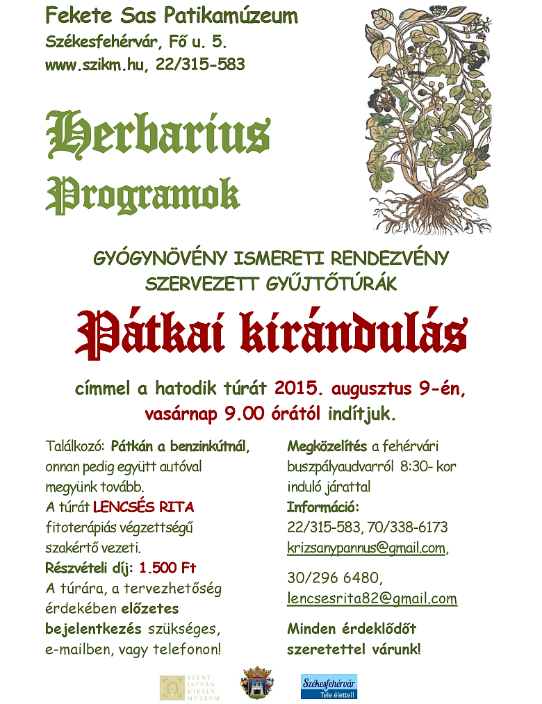 Augusztus 9-én, vasárnap a hatodik túra keretében az eddigi alkalmakat színesítve, még több lelőhelyet keresnek fel a programon résztvevők a hasznos gyógynövények begyűjtésére. Ezúttal a Pátka környéki növényeket fedezik fel. A találkozó Pátkán a benzinkútnál lesz, onnan pedig együtt autóval megy tovább a csoport. Megközelítés a fehérvári buszpályaudvarról 8:30-kor induló járattal lehetséges. A túrát Lencsés Rita fitoterápiás végzettségű szakértő vezeti, a részvételi díj: 1.500 Ft.Információ a túráról a 22/315-583-es és a 70/338-6173-es telefonszámon vagy a krizsanypannus@gmail.com, lencsesrita82@gmail.com címen kérhető. Minden érdeklődőt szeretettel várnak!