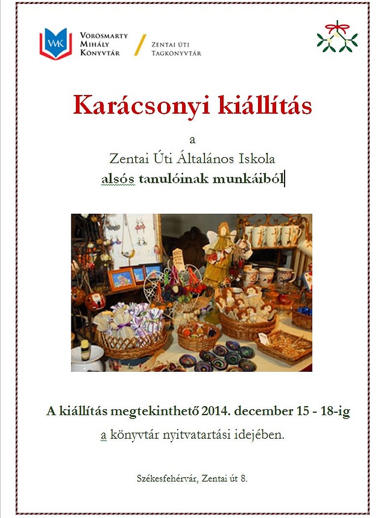 2014. december 15-től 18-ig újabb karácsonyi kiállítás lesz megtekinthető a Vörösmarty Mihály Könyvtár Zentai utcai Tagkönyvtárában (Székesfehérvár, Zentai út 8.). A négy nap során a Zentai úti Általános Iskola tanulóinak munkáit lehet majd megnézni a program keretében. A tárlat hivatalos megnyitóját december 15-én, hétfőn este 18 órakor tartják. A kiállítás megtekinthető 2014. december 15 - 18-ig a könyvtár nyitvatartási idejében.