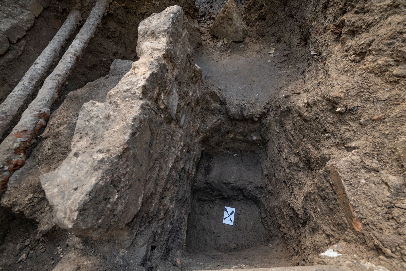 A régészeti megfigyelés során dr. Reich Szabinának és csapatának sikerült középkori objektumokra bukkaniuk. "Ez a terület a korai történeti városmagtól északra helyezkedett el, ahol kisebb utcák mentén házak álltak. Ezek közül egyet találtunk meg, annak is a pincefalát. Az előkerült bejárat segített az azonosításban, melynek jól látható a faragott ajtókőkerete és a köszöbköve. Sajnos az újkori bolygatások miatt nem sok maradt meg belőle, viszont az innen előkerült leletek alapján feltételezhető, hogy középkori falról lehet szó. Az itt előkerült kerámiaanyag döntő többsége a 14–16. századból származik. Jól lehet látni, hogy egy nagyon szabályosan rakott falazatot találtunk, amelyet törtkövekből építettek habarccsal, viszont magának a pince lejáratának az oldalfalát téglából alakították ki, hogy egyenes falszakaszt kapjanak. Magát a küszöbkövet pedig kőből faragták ki." – árulta el dr. Reich Szabina.