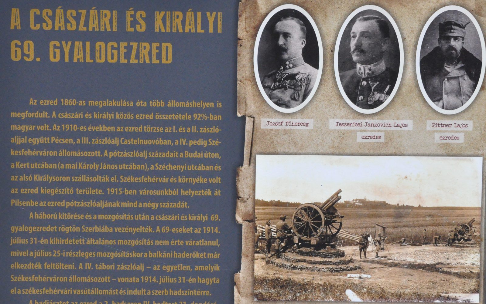 A „Kik acél falakként állották a vártát, orosz ingovány s Doberdó tetején” című szabadtéri tablókiállítás első fejezete tavaly május végétől augusztusig fogadta a látogatókat a Városház téren. A tárlat az első világháború azon főbb eseményeit mutatta be a kitöréstől 1915 nyárig, amelyek valamilyen módon köthetőek a székesfehérvári katonai alakulatokhoz. A sorozat a második kiállítással folytatódik péntektől. A szervezők célja, hogy emléket állítsanak a küzdelmekben részt vett katonahősöknek és jobban megismertessék a közönséggel Székesfehérvár katonamúltját.