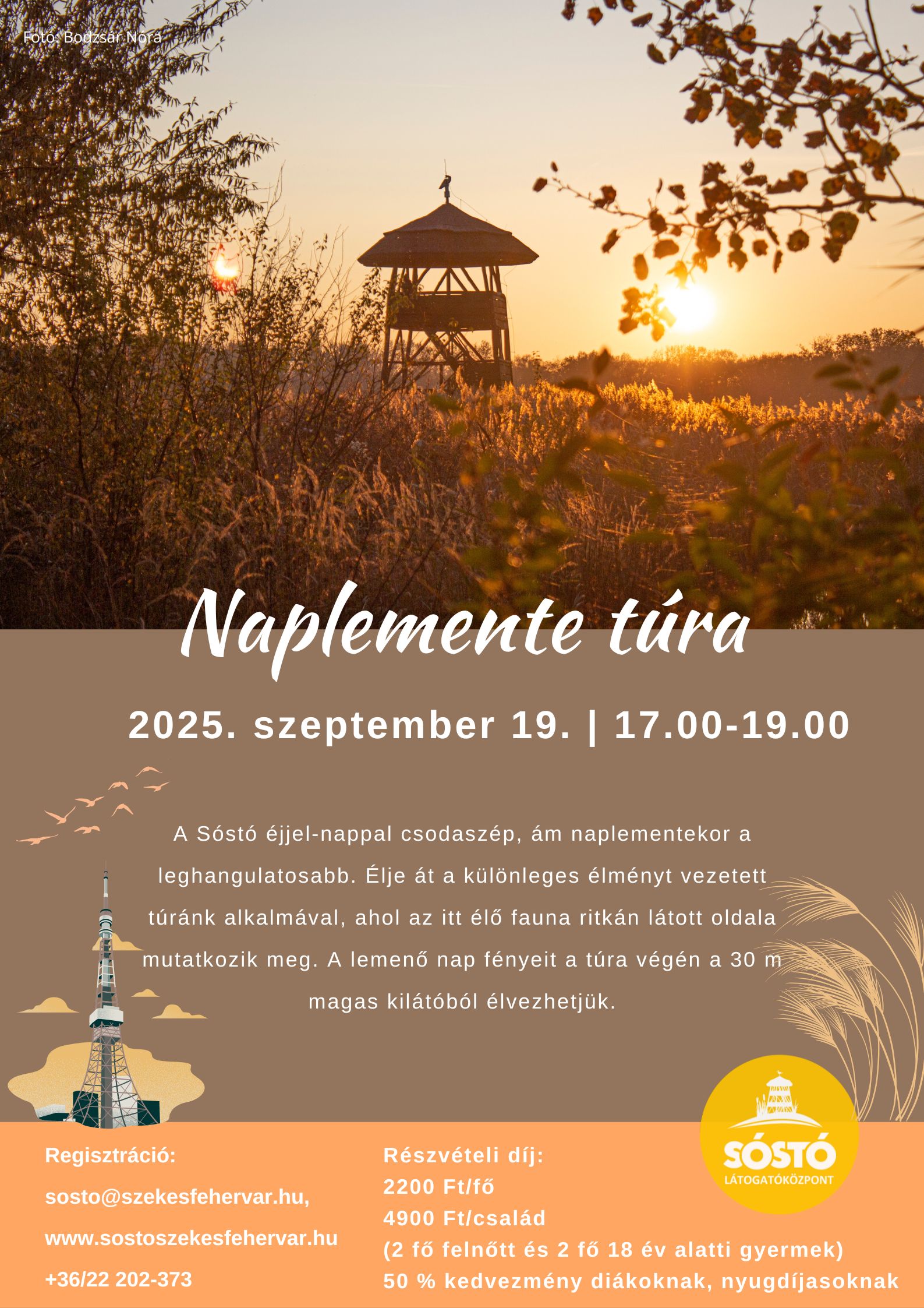 A kétórás túrán megfigyelhetjük a páratlan élővilágot, az állatok nem mindennapi viselkedését és gyönyörködhetünk a nem mindennapi égi jelenségekben. A lemenő nap fényeit a 30 méter magas kilátóból élvezhetik a kirándulók. A részvételhez regisztráció szükséges a sosto@szekesfehervar.hu e-mail címen vagy a 22/202–373-as telefonszámon.