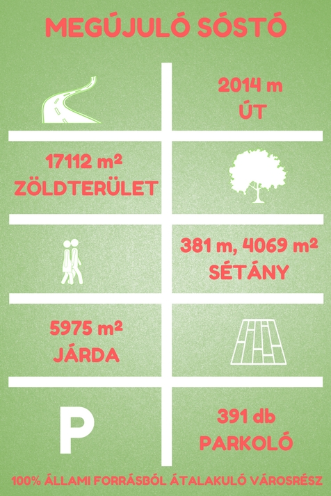Szintén megépült a Sóstó Természetvédelmi Területre vezető térkő burkolatú sétány, valamint a Stadion sétány, ami a Sóstói temető oldalában, a megújuló Sóstói Stadion vendégszektorának bejáratához vezet. Megtörtént a Hosszúsétatér Csíkvári úttól délre eső szakaszának és a Temető utcának a teljes felújítása 293 méter hosszon. A lehulló csapadékvíz összegyűjtésére és tisztítására 280 méter csapadékcsatorna, 15 akna és 185 méter hosszúságú vízelvezető-szegély, valamint egy olajfogó műtárgy épül. A tisztított csapadékvizet a Sóstó vizébe engedik majd.