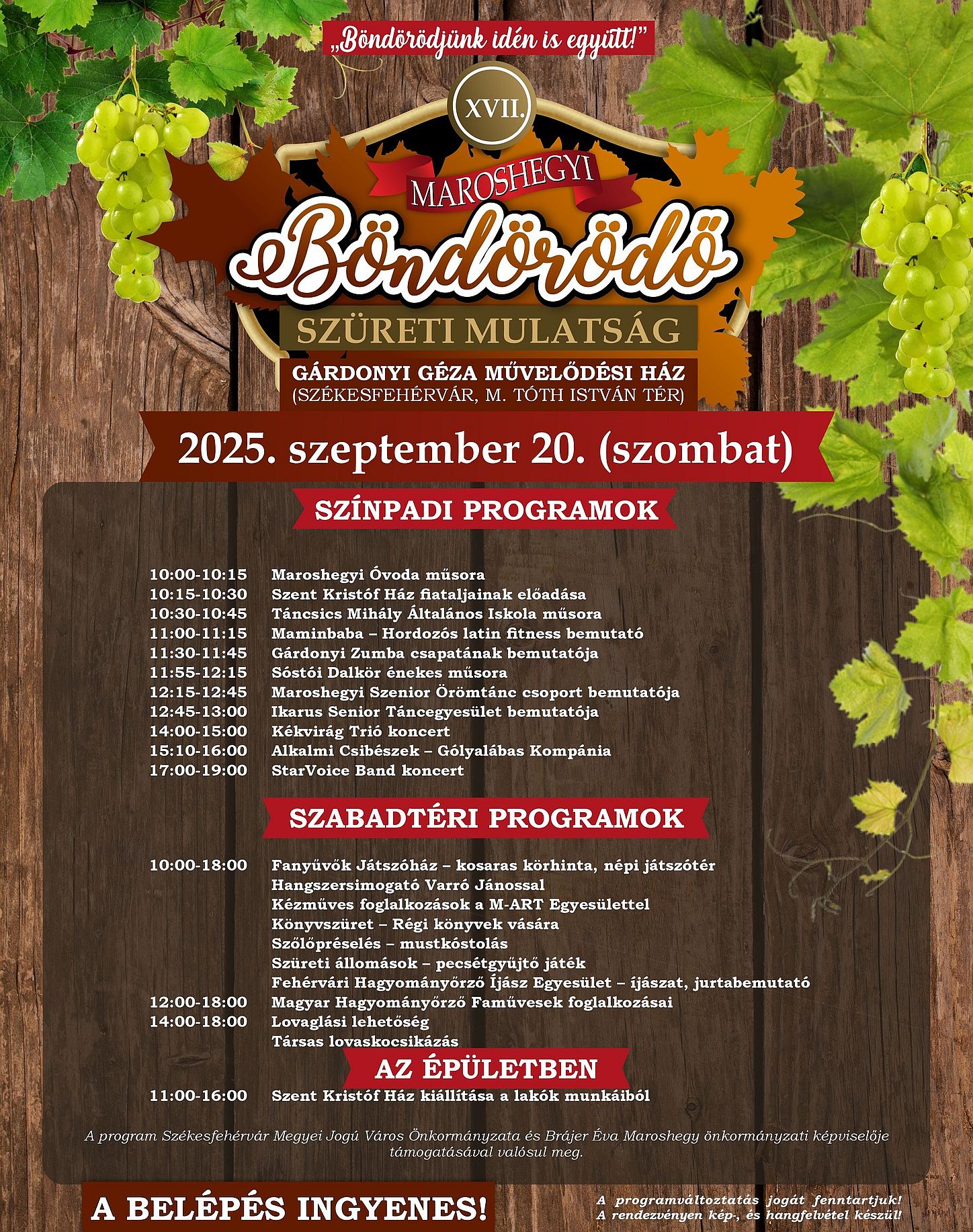 A programok 10.00 órától kezdődnek, egész nap lesz kosaras körhinta, népi játszótér, hangszersimogató, többféle kézműves foglalkozás, könyvszüret, azaz régi könyvek vására, szüreti pecsétgyűjtő játék és szőlőpréselés mustkóstolással.