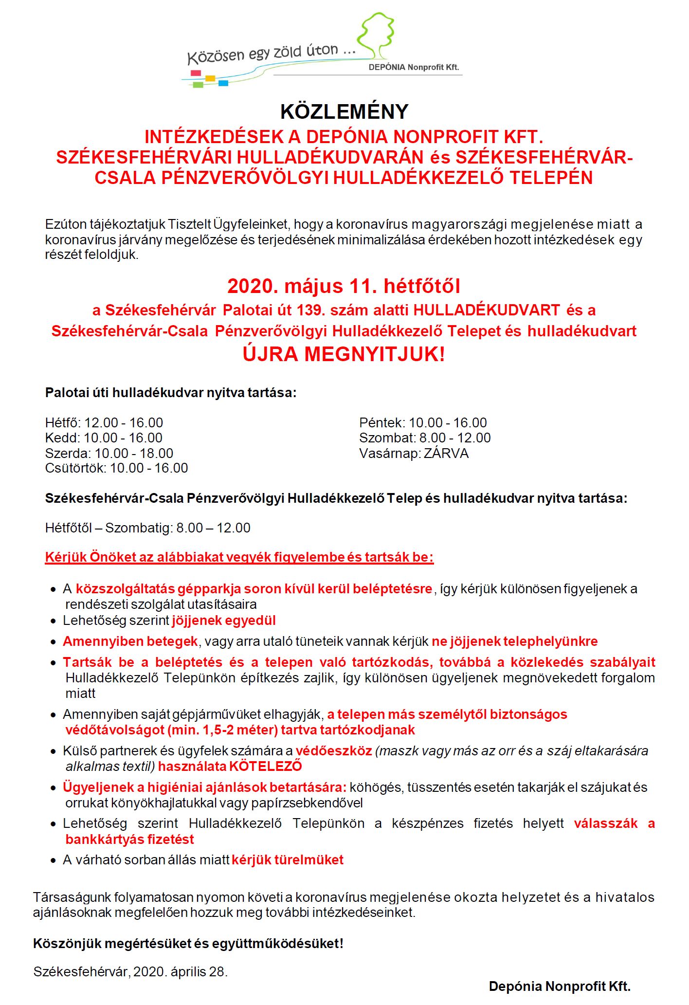 A cég kéri, egyben elvárja a védőmaszk használatát a lakosság részéről is! A Palotai út 139. szám alatti hulladékudvar is üzemel hétfőtől. A nyitva tartás a korábban megszokottaknak megfelelően alakul, az alábbiak szerint: hétfő: 12.00 - 16.00 kedd: 10.00 - 16.00 szerda: 10.00 - 18.00 csütörtök: 10.00 - 16.00 péntek: 10.00 - 16.00 szombat: 8.00 - 12.00 Vasárnap: ZÁRVA A Depónia arról is tájékoztatott, hogy május 18-tól ismét elindul a házhoz menő lomtalanítás, melyre már most lehet időpontot foglalni.