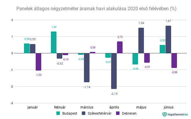 Egyedül a sorházak esetében figyelhetünk meg jelentősebb négyzetméterenkénti átlagárcsökkenést az elmúlt félévre visszatekintve. Januárban ezekért az ingatlanokért négyzetméterenként átlagban 491,5 ezer Ft-ot kértek, míg júniusban csaknem 15%-kal kevesebbért lehetett egy hasonló házhoz jutni. A panellakások négyzetméter-átlagárai az egy évvel ezelőtti adatokhoz viszonyítva júniusra 5,6%-kal emelkedtek, ez forintban csaknem 1 160 000 Ft-tal magasabb vételárat jelent egy 50 négyzetméteres panel esetében.