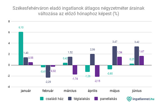 Ha az összes ingatlantípust tekintjük, hogy a Székesfehérváron eladó családi házak átlagos négyzetméter árai az év eleji árakhoz viszonyítva júniusra csaknem 1,8%-os csökkentést mutattak, míg a tavalyi év azonos időszakához képest azok kb. 7,26%-kal emelkedtek.