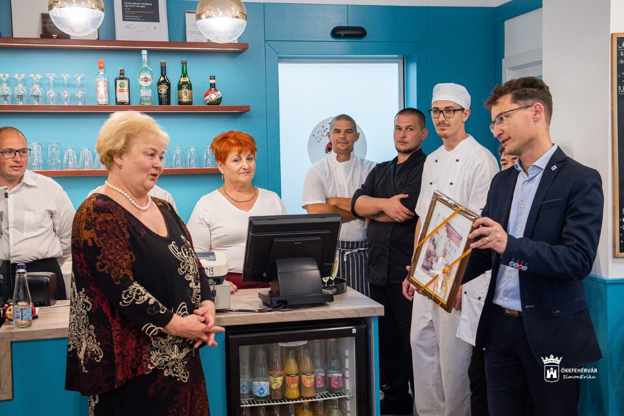 Dr. Cser-Palkovics András arról szólt, hogy amikor egy városról beszélgetünk, akkor sok minden elhangzik, amire közösségként büszkék lehetünk. Örömét fejezte ki, hogy Székesfehérváron ezek közé az értékek közé tartozik a Hatpöttyös Étterem is. Ezért is segített mindenki – ki-ki a saját őrhelyén –, hogy a hagyomány folytatódhasson. A polgármester egy a város jelképét, az Országalmát ábrázoló festményt ajándékozott az étteremnek. Megköszönte Hermann-né Vera kitartását, hogy viszi ezt a missziót, és hogy minden körülmények között együtt tartotta a Hatpöttyös stábját, akikkel új otthonra találtak a Prohászka Ottokár utca 16. szám alatt.