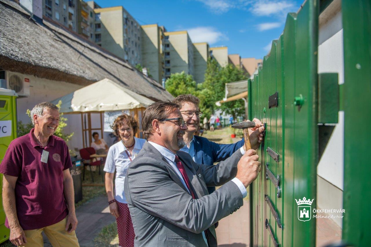 A résztvevők az I. András Királyi Lovagrend felvezetésével mentek át a Kézművesek Házához, ahol felszegelték a fesztivál emléktábláját a porta kapujára Viza Attila palotavárosi önkormányzati képviselővel közösen.