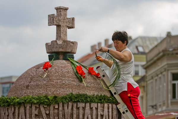 Pénteken kora délutánra elkészültek a csodálatos virágkompozíciók Székesfehérvár Belvárosában. A fehérvári virágkötők idén is a Városház téri és környéki köztéri alkotásokat díszítették fel, így díszbe öltözött többek között Pátzay Pál alkotása, a 10-es huszárok emlékműve, az Országalma, a Püspöki Palota és a Milleniumi Emlékjel is. A Pünkösdi Virágálom közreműködőit Székesfehérvár polgármestere nevében Márton Zoltán képviselő köszöntötte. (fotók: Wágner Csapó József)