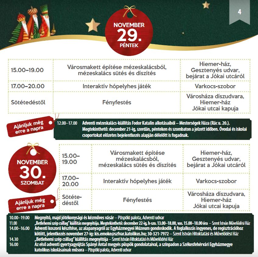 13 órától 18 óráig az Advent a Rác utcában program első szombatján „Adjon Isten sokakat, szép karácsony napokat…” mottóval zajlik kreatív ünnepváró program a Kézművesek Házában, lesz mézeskalács-sütés és -díszítés, adventi forgatag, kézműves tárgyak vására, 15 órától sült gesztenye és forró tea, 16 órakor pedig „Az égig érő fa” címmel a sárszentmihályi Mákvirág bábcsoport előadását láthatjuk.