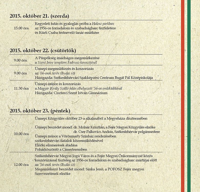 Ebben az évben is közösen emlékezik meg az ’56-os forradalom hősi napjairól Székesfehérvár és Fejér megye Önkormányzata. A programsorozat 2015. október 21-én, szerdán a huszonegy éves múltra visszatekintő hagyományos kegyeleti futással és gyalogláspróbával kezdődik a Halesz ligetben. A futók itt a szabadságharc mártírjainak emlékére 1956 métert futnak, a nyugdíjasok ugyanezt a távot gyalogosan tehetik meg. A próba évek óta összekapcsolódik Kürti Csaba, a város legendás testnevelő tanárának emlékezetével is, az ő halálának évfordulója is az októberi ünnepségsorozat idejére esik.