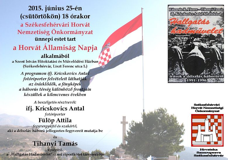 1991. június 25-én két jugoszláv tagköztársaság, Szlovénia és Horvátország parlamentje elfogadta a szuverenitásáról és függetlenségéről szóló nyilatkozatot, ezzel megkezdődött a jugoszláv föderáció szétszakadása. Június 25-e a Horvát Államiság Napja, az alkalom tiszteletére ünnepi estet szervet a Székesfehérvári Horvát Nemzetiségi Önkormányzat csütörtökön 18.00 órától a Szent István Hitoktatási és Művelődési Ház Szent László termében. A programon előadást tart Tihanyi Tamás újságíró, „A Hallgatás Hadművelet” című riportkötet társszerzője. A délszláv háborús írásokat, tudósításokat tartalmazó, 1996-ban kiadott kötetet ifj. Kricskovics Antal fényképeivel illusztrálták. A fotóriporter szintén rész vesz a csütörtöki eseményen, és megismerteti a nézőkkel a háborús térség különböző frontjain készült munkáit. Ugyancsak jelen lesz a beszélgetésen Fülöp Attila fegyvergyűjtő és szakértő, aki bemutatja a délszláv harcok jellegzetes fegyvereit.