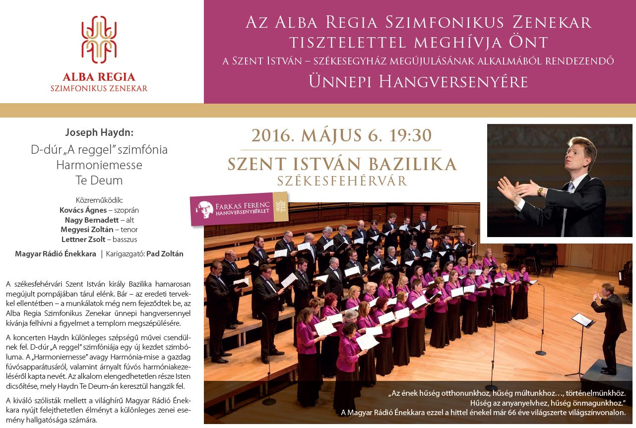 A megújulás tiszteletére ünnepi koncertet ad az Alba Regia Szimfonikus Zenekar május 6-án, pénteken 19.30 órakor, a Farkas Ferenc hangversenybérlet keretében. Az eseményen Joseph Haydn, a „szimfóniák királya” művei csendülnek fel. D-dúr szimfóniáját az angliai körútja során írta a londoni közönség számára, a „Harmoniemesse”, avagy Harmónia-mise pedig a gazdag fúvósapparátusról, valamint árnyalt fúvós harmóniakezeléséről kapta nevét. Az eseményen közreműködik Kovács Ágnes (szoprán), Nagy Bernadett (alt), Megyesi Zoltán (tenor), Lettner Zsolt (basszus), továbbá a Magyar Rádió Énekkara és Pad Zoltán karigazgató. Jegyek válthatóak a Vörösmarty Színház jegyirodáján, amely hétfőtől péntekig 10.00-18.00 óra között tart nyitva.