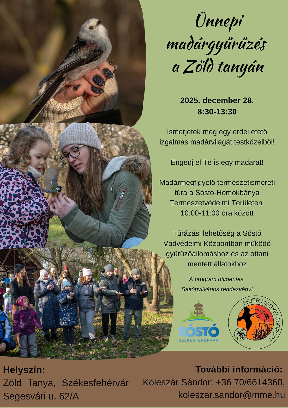Az ünnepi madárgyűrűzés egy hagyományos program, melynek résztvevői testközelből megismerhetik az erdei madáretetők világát. A madárgyűrűzés december 28-án, vasárnap 8.30 és 13.30 óra között zajlik a Zöld tanyán. Közben 10.00 és 11.00 óra között madármegfigyelő túrát szerveznek a Sóstó Homokbánya Természetvédelmi Területen, valamint el lehet sétálni a Sóstó Vadvédelmi Központba, ahol a gyűrűzőállomás található és lehet ismerkedni az éppen gondozás alatt álló vadállatokkal.