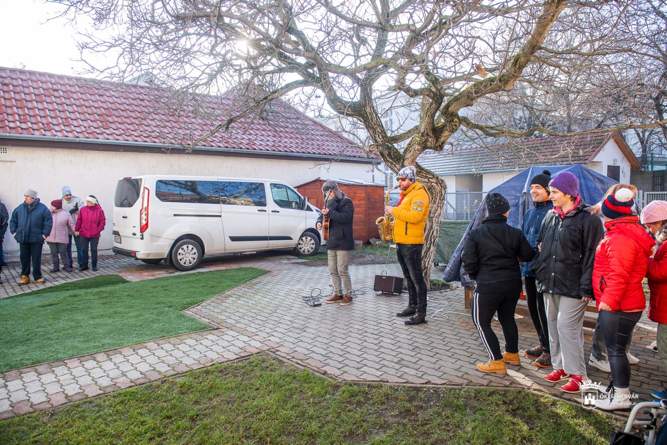 A Rudolf, a piros orrú rénszarvas című népszerű dallal indult az ünnepi műsor a Kossuth Zsuzsanna Szociális Intézmény Rákóczi utcai Idősek Otthonában és a Frim Jakab Képességfejlesztő Szakosított Otthonban. Mits Márton szaxofonos és Horváth Dávid gitáros népszerű, karácsonyhoz kötődő dalokból állította össze műsorát, melyet az intézmények dolgozói és lakói is nagy örömmel fogadtak. Az első koncertet Mészáros Attila alpolgármester is meghallgatta.