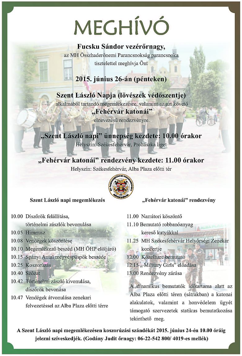 Szent László királyra emlékeznek június 26-án, pénteken Székesfehérváron. Koszorúzást tartanak az uralkodó Prohászka ligeti szobránál, majd 11.00 órakor az Alba Plaza előtti téren rendezik meg a „Fehérvár katonái” bemutatónapot.