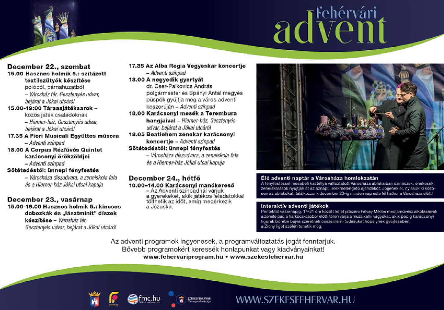 A Belváros ünnepi fényekbe öltöztetett utcáin zenélő padok, ledes fény- és hópelyhes játék és fényfestés teszik még hangulatosabbá a sétákat sötétedéstől, a város fája alatt pöfög még a mesevonat, és a karácsonyi vásárban sétálók meleg italok mellett beszélgethetnek egy jót. Advent utolsó hétvégéjén is mindenkit szeretettel várnak az egyházi, a városi és az intézményi programokra, ahol a fehérváriak együtt készülődhetnek a várva várt ünnepre.