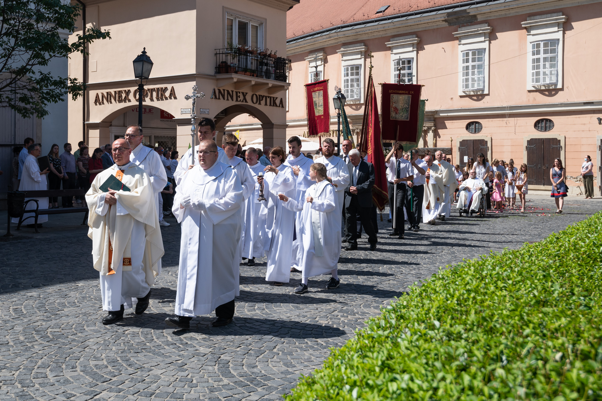 A főpásztor a szentmisét követően ünnepélyes körmenetben hordozta körül az Oltáriszentséget a Belvárosban, ahol négy oltárt állítottak fel a körmenet útvonala mentén.