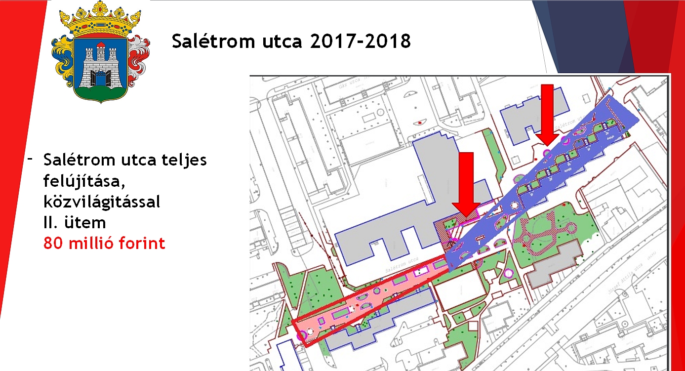 A körzet önkormányzati képviselője, Molnár Tamás a következő két évben megvalósuló fejlesztések között említette a Salétrom utca felújítását, ami tavaly már elkezdődött. Közel 35 millió forintból valósult meg az első ütem és a felújítás 2017-ben is folytatódik: mintegy 80 millió forintból újul meg teljesen a Németh László Általános Iskola előtti tér és a közvilágítás. Az itt kialakuló közösségi tér lehetőséget ad arra, hogy rendezvényeket szervezzenek és közösségi programokon találkozzanak egymással az ott élők.