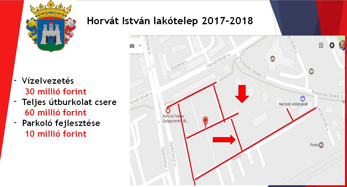 A Horvát István lakótelepen a vízelvezetési problémák megoldása és a közműcserék mellet kezdődik a lakótelepen a teljes útfelület és járdafelület felújítása és új parkolóhelyek kialakítása. A Deák Ferenc utcai négyemeletesek mögötti útburkolat felújítása is idén történik. Az 1960-ban épült házak közötti kis utcák teljes burkolat-felújítása mintegy 43 millió forintba kerül majd. Molnár Tamás beszámolt arról is, hogy a Lövölde úton parkolóépítés lesz, ami régi igénye már az ottlakóknak: a „Széphő” épülete mögött mintegy 50 parkolóhelyet alakítanak ki.