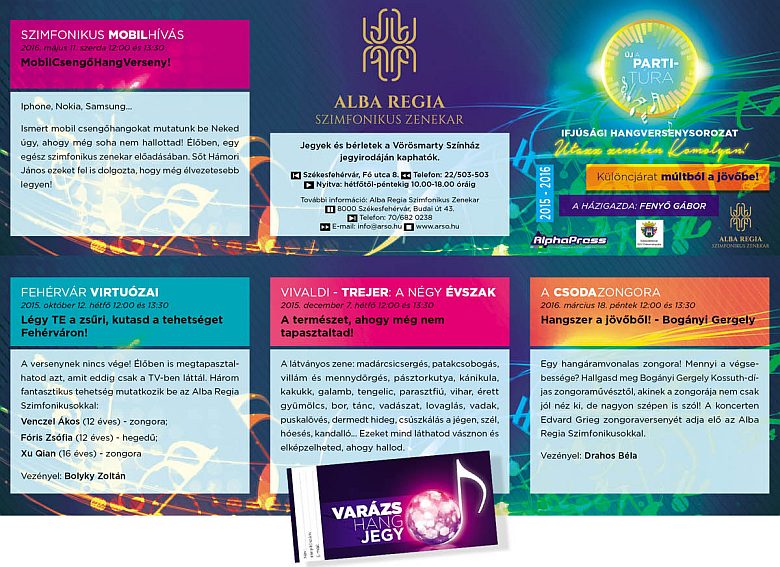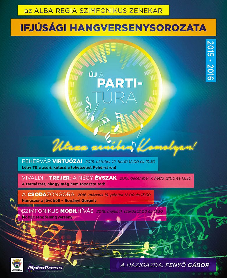 Major István, az Alba Regia Szimfonikus Zenekar igazgatója elmondta, hogy az Új a Parti -Túra ifjúsági hangversenybérlet négy koncertet foglal magába dupla előadásban. Az első koncerten, október 12-án három fantasztikus tehetség, Venczel Ákos, Fóris Zsófia és Xu Qian mutatkozik be, majd a természet hangjaival ismerkedhetnek meg a diákok a Négy évszak koncerten, ahol a színház valamennyi technikai eszközét latba vetik, hogy felejthetetlen élménnyel távozzanak a diákok. A sorozat folytatásaként Bogányi Gergely zongoraművész hozza el „hangáramvonalas” zongoráját és meg is mutatja a gyerekeknek ezt a fantasztikus hangszert. A sorozatot „mobilcsengőhangverseny” zárja majd.