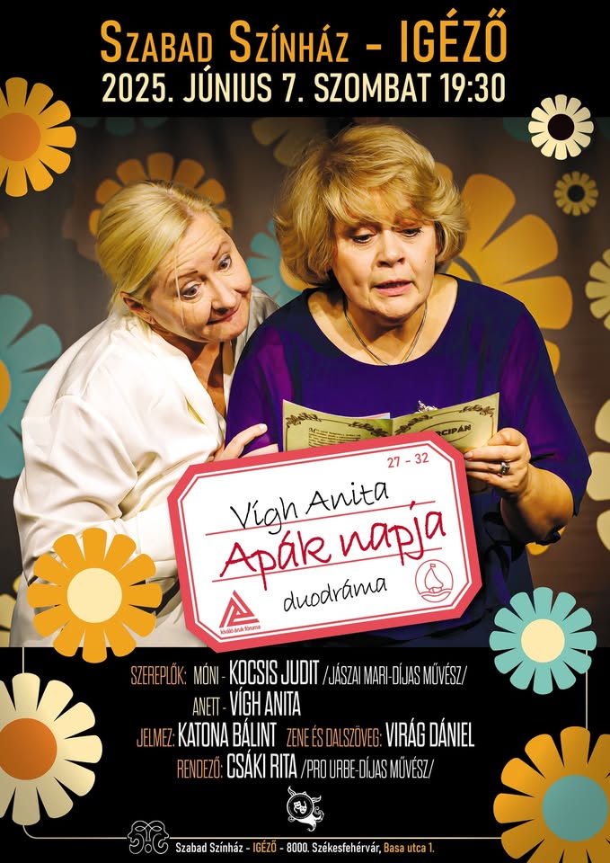 A szombat estét a közelgő Apák napja alkalmából az azonos című, Csáki Rita által rendezett derűs előadás, valamint Tóth Emőke irodalmi kvíze és a Méhkasaula Egyesület fényfestése zárja.