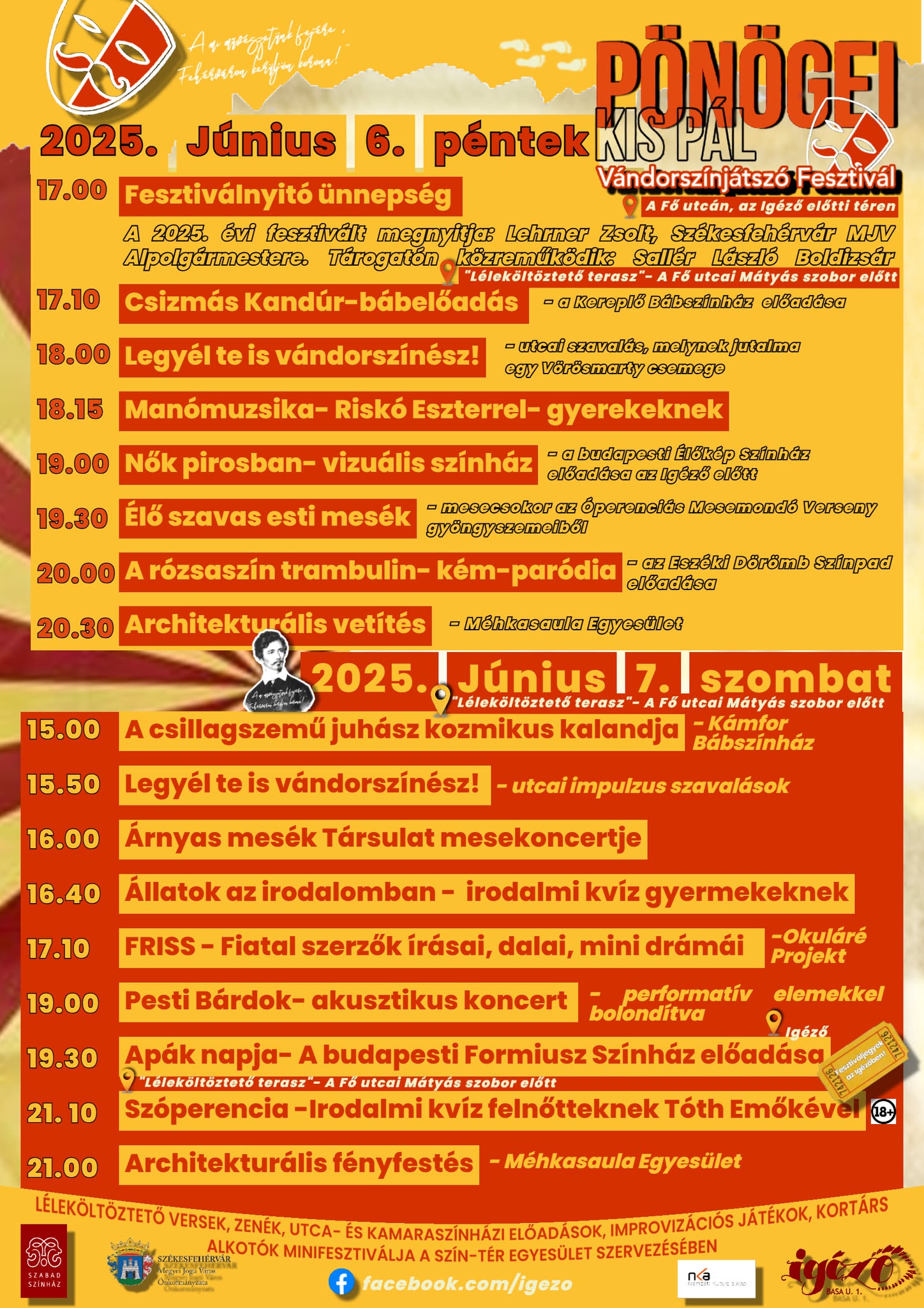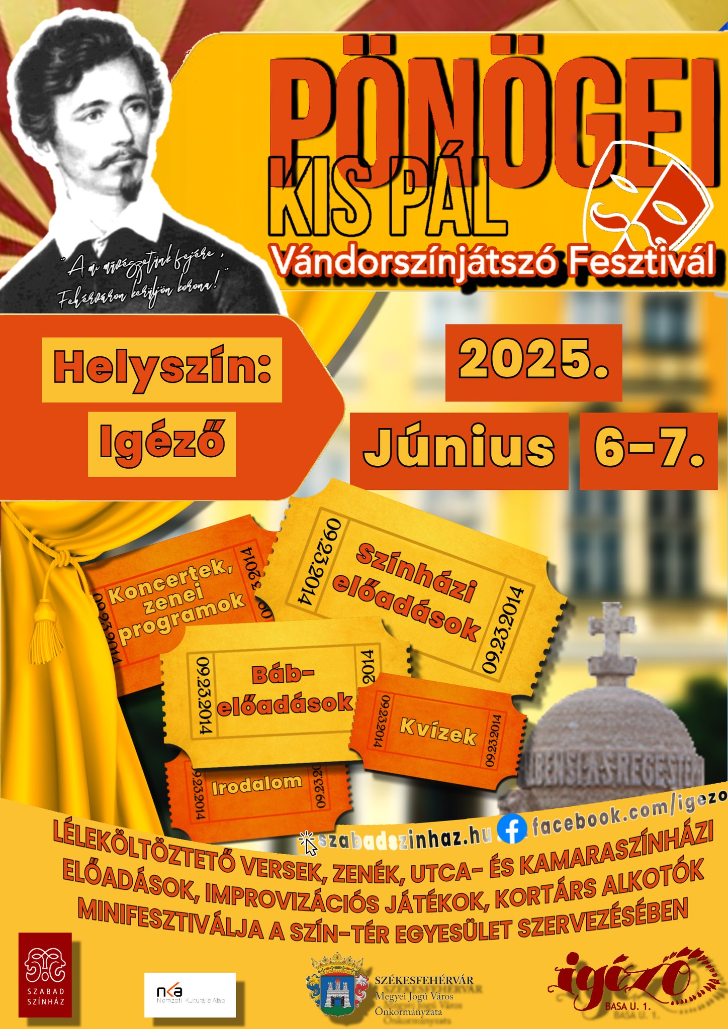 Bábelőadások, koncertek, utca- és kamaraszínházi előadások sora várja a Belvárosba érkezőket június 6. péntek délutántól a III. Pönögei Kis Pál Vándorszínjátszó Fesztiválon. A Szín-Tér Egyesület minifesztiválját június 6-én és 7-án rendezik a Fő utcai Igézőben, és az épület előtt, a Belvárosban. A programok ingyenesek, Petőfi Sándor fiatal vándorszínészi múltjának, és fehérvári első szerepléseinek állítanak emléket.